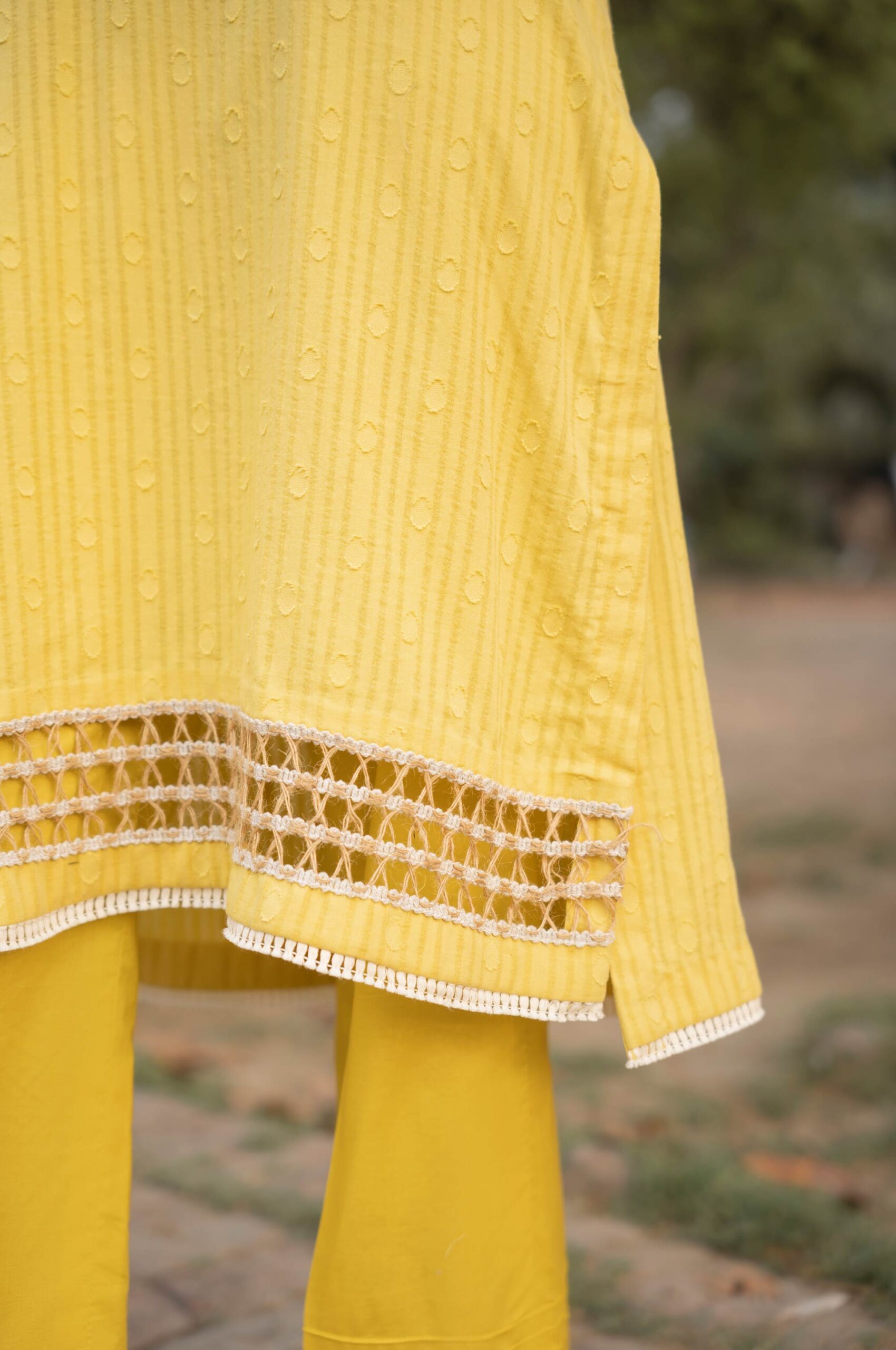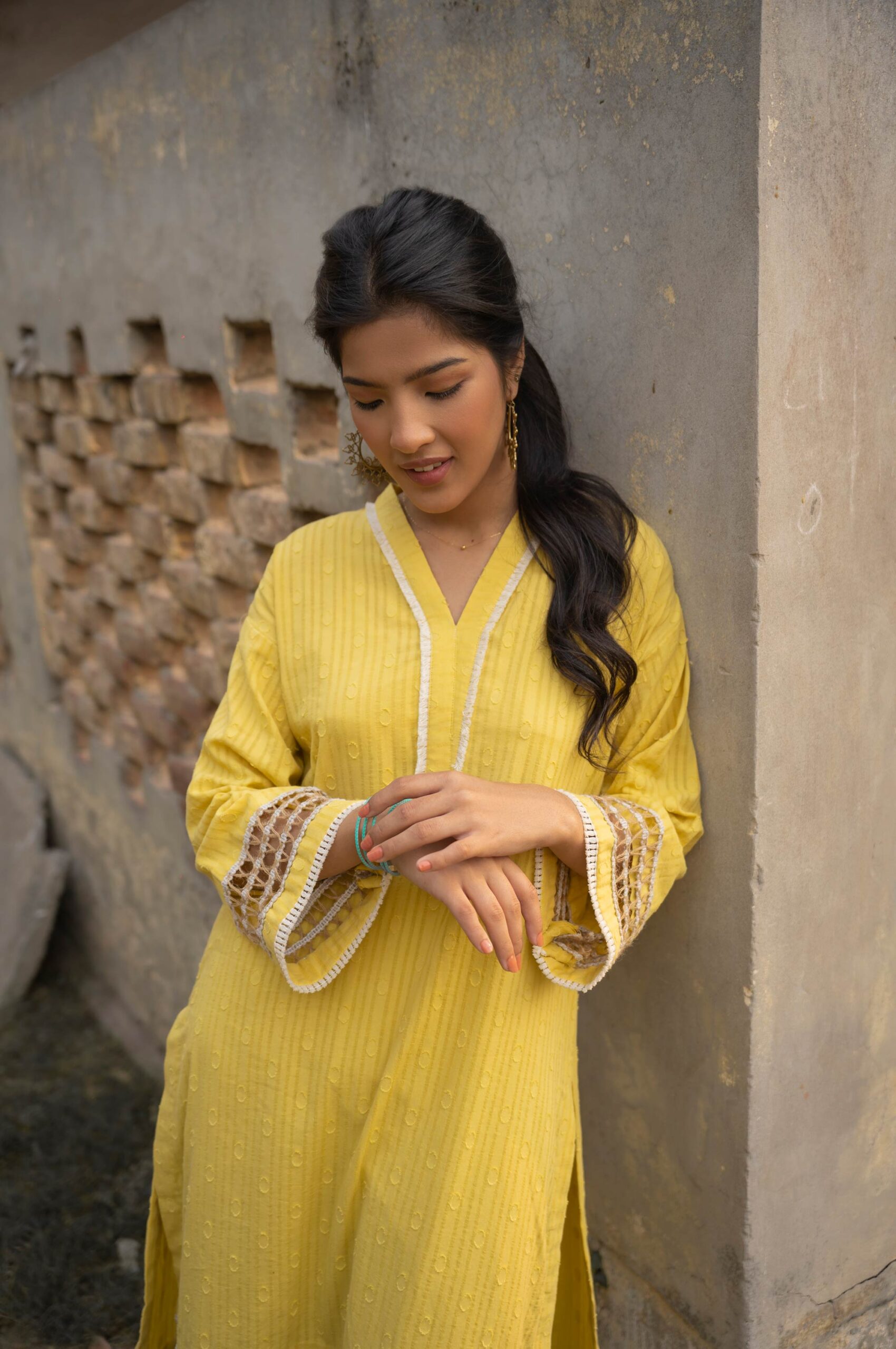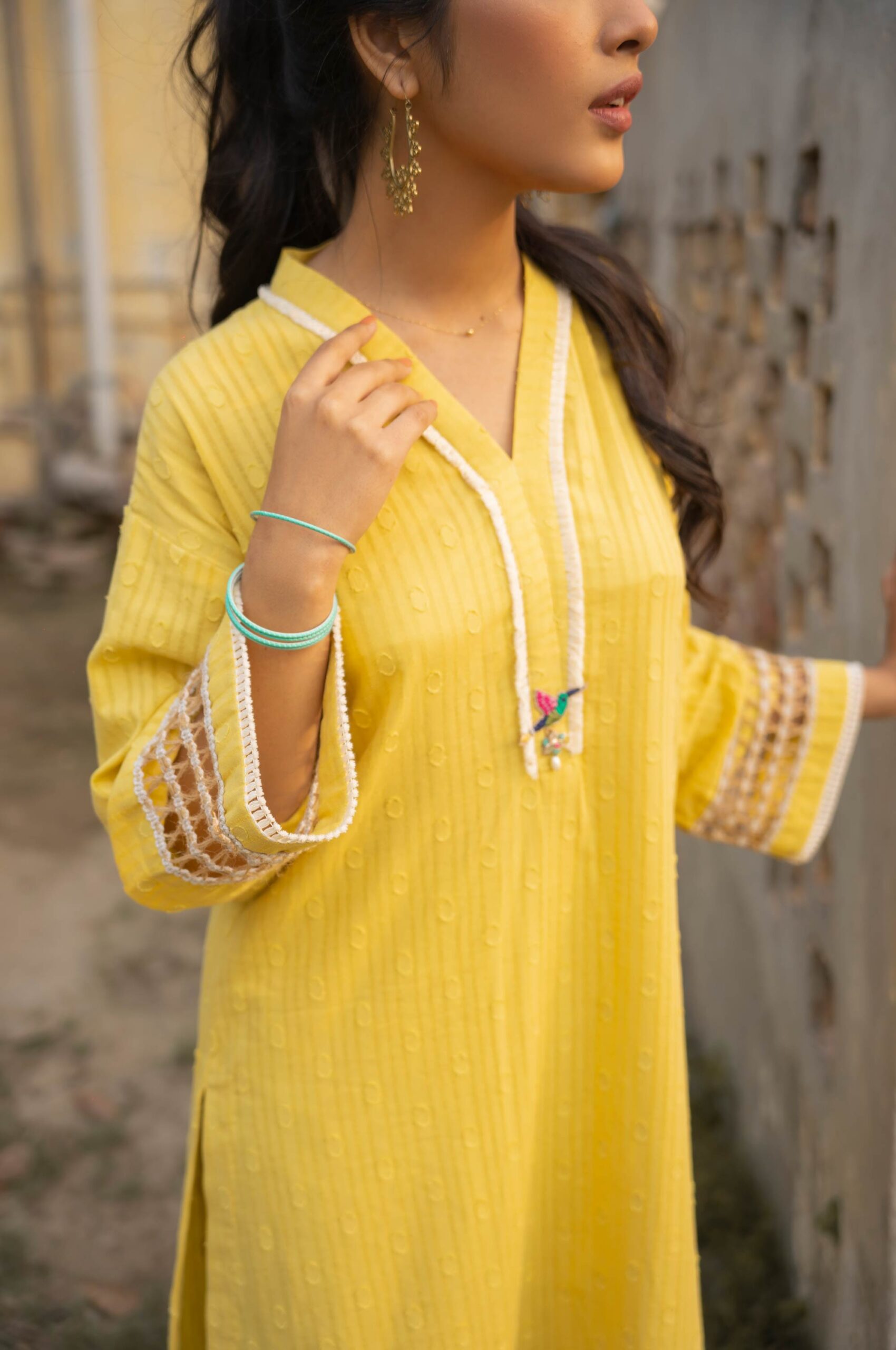 Self Brochia shirt with hand-made embroidered bird motif and button on the front, with cut work jute lace on the sleeves and hem. Paired with pleated cotton culottes.