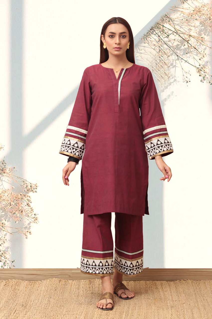 A two-tone dark maroon cotton khadi shirt, elaborated with our hand made block borders on sleeves and pahncha with gold patti, can be paired with a hand block printed fine lawn