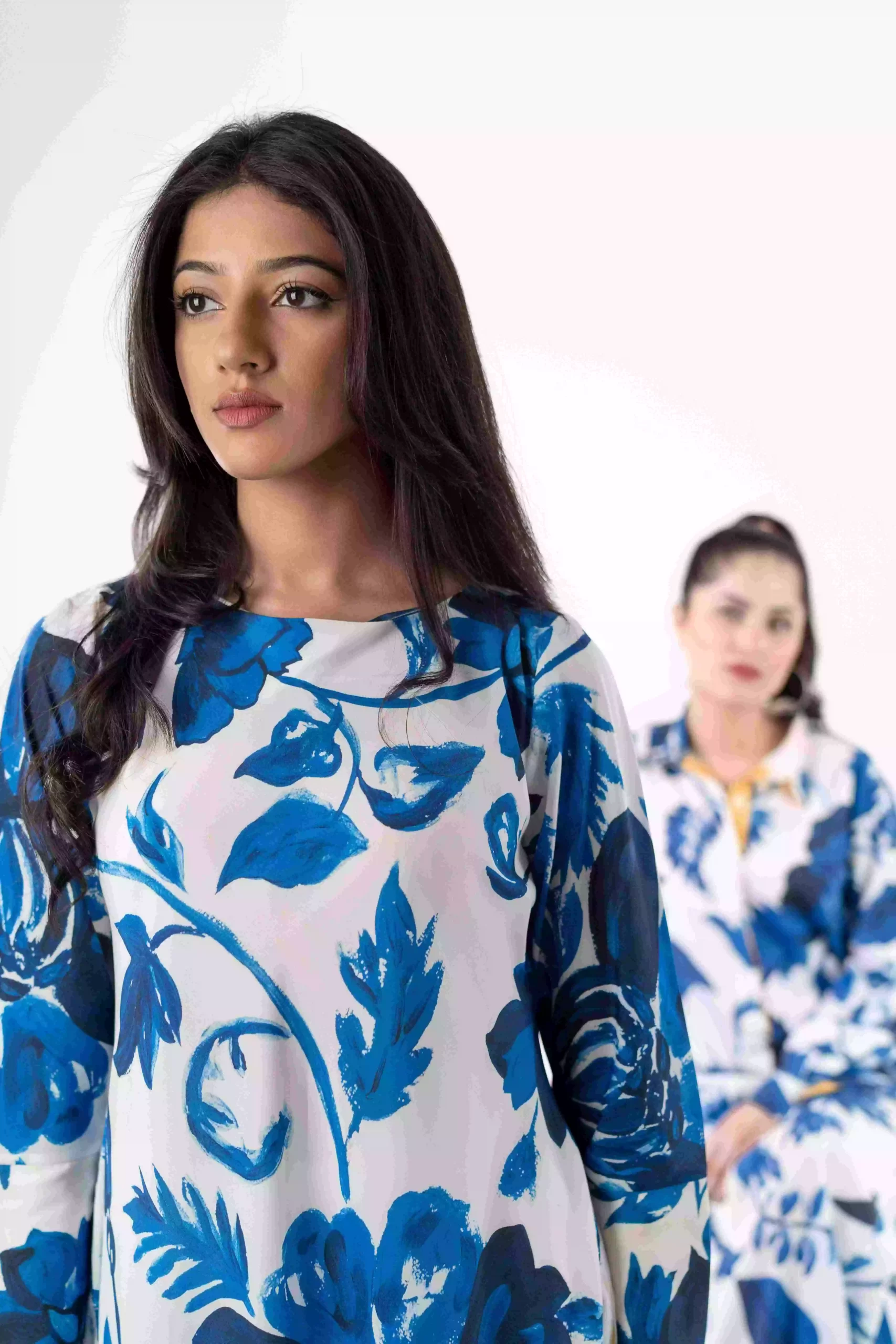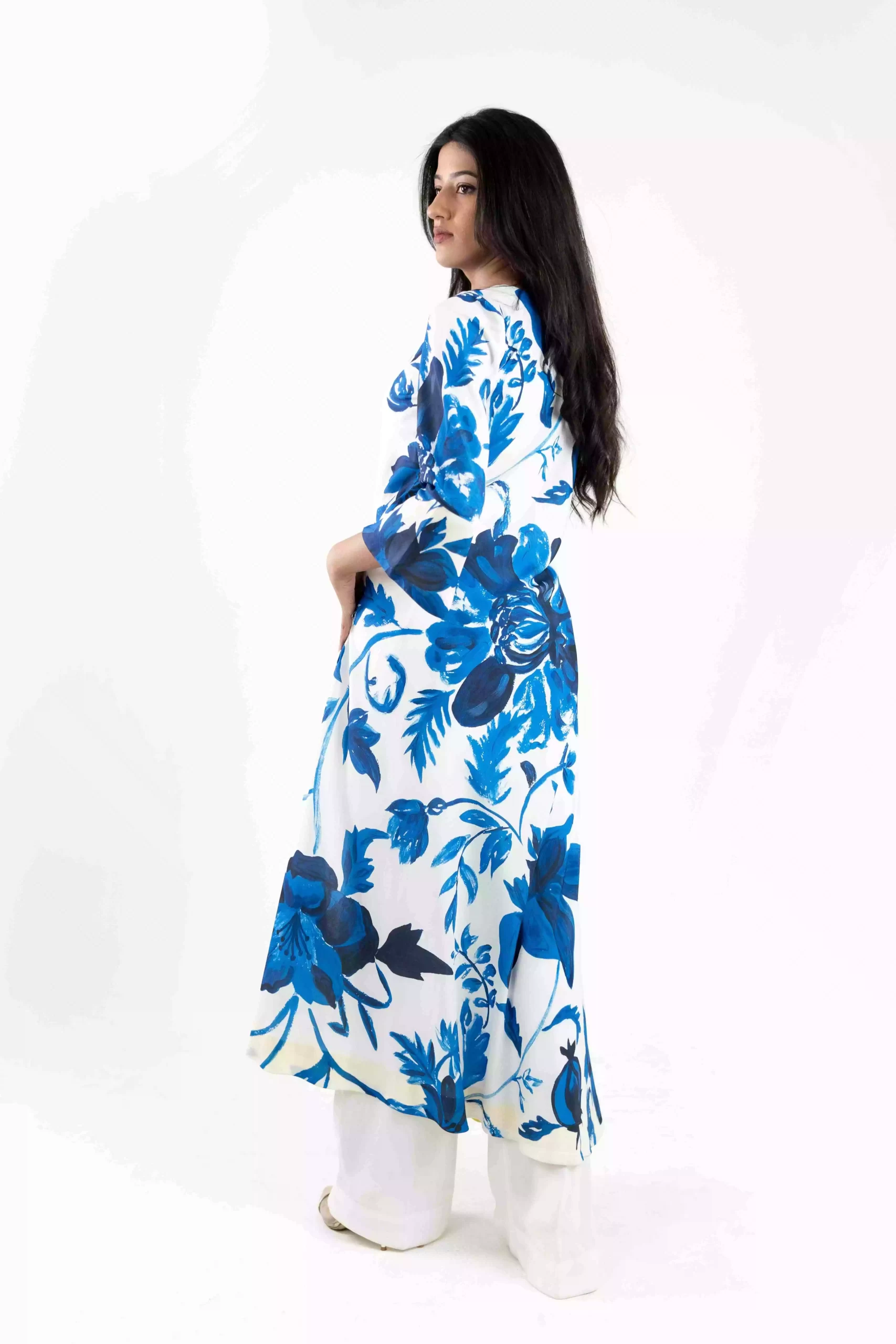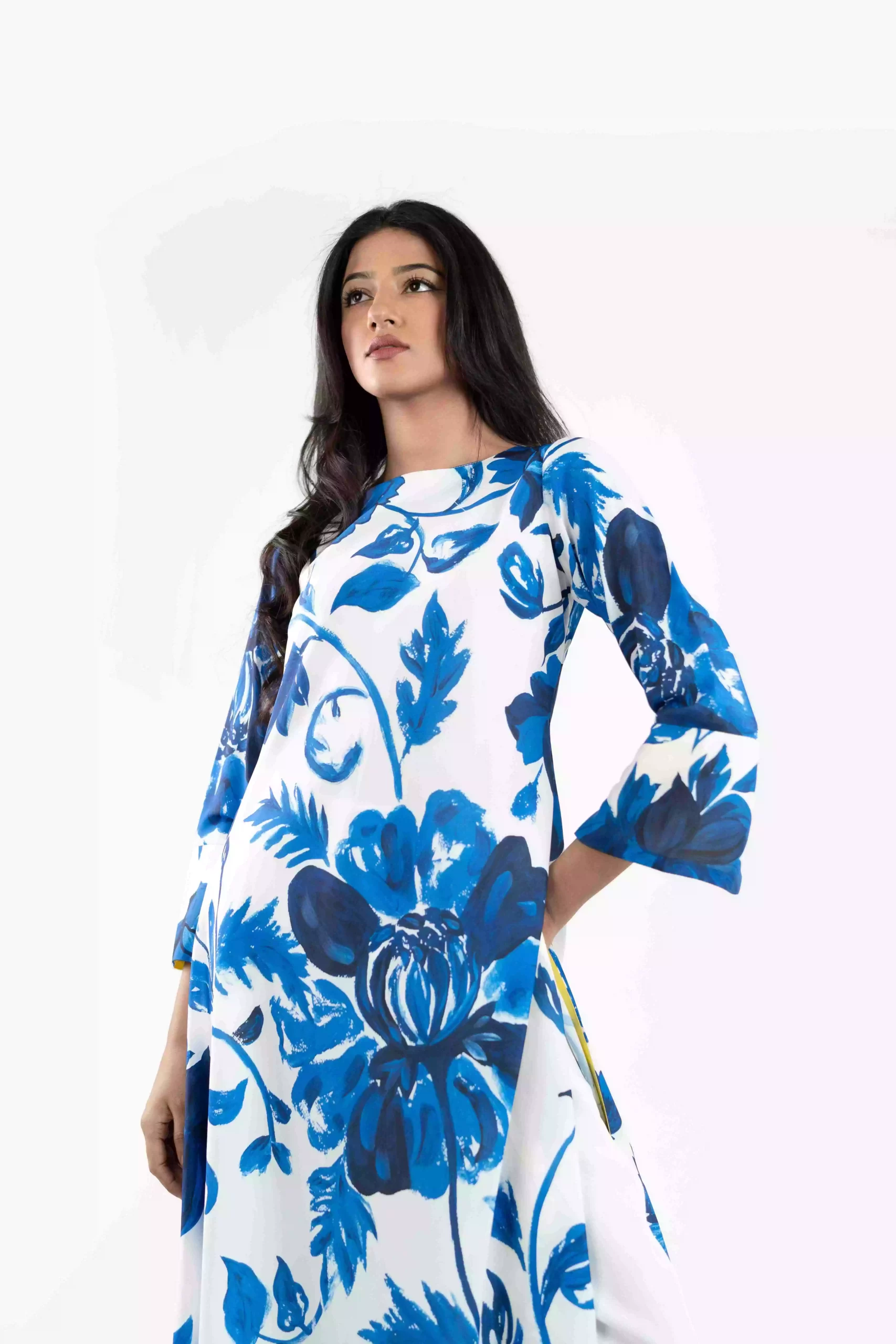 Long Floral Shirt made in grip Silk fabric with side slit and yellow facing slit, can be paired with white pants