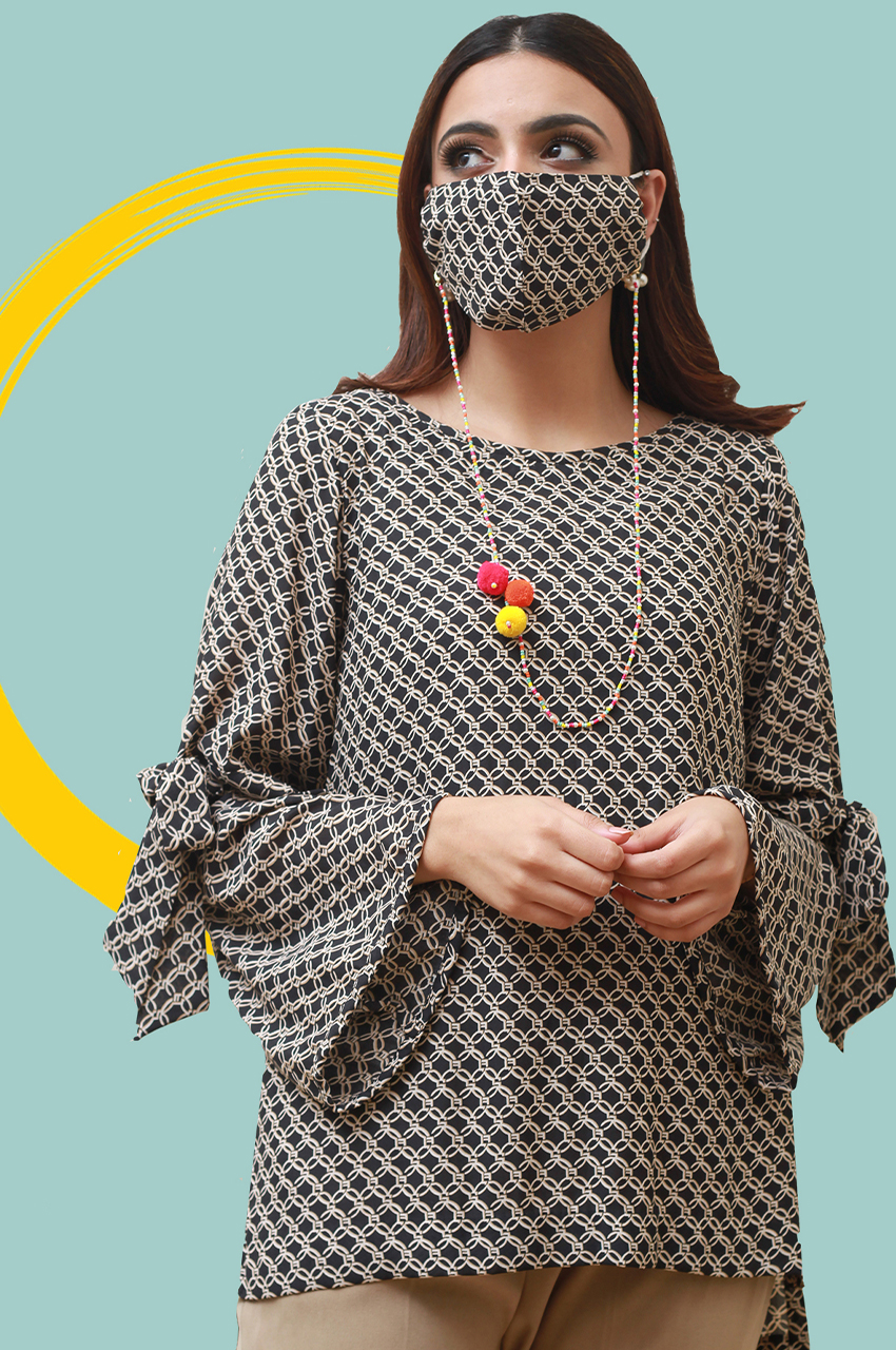 Grip linen top with ties at the sleeves paired with a must have chained mask with hanging pom poms