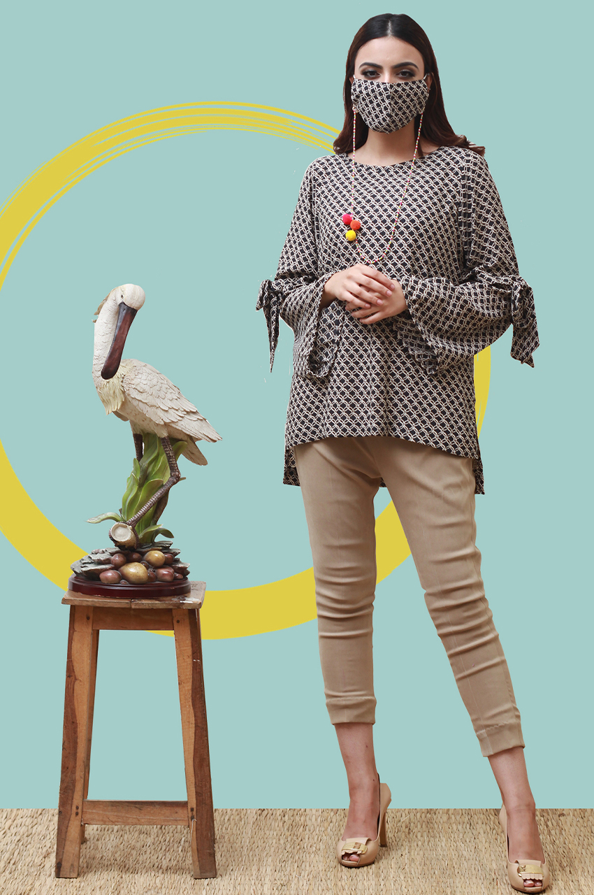 Grip linen top with ties at the sleeves paired with a must have chained mask with hanging pom poms