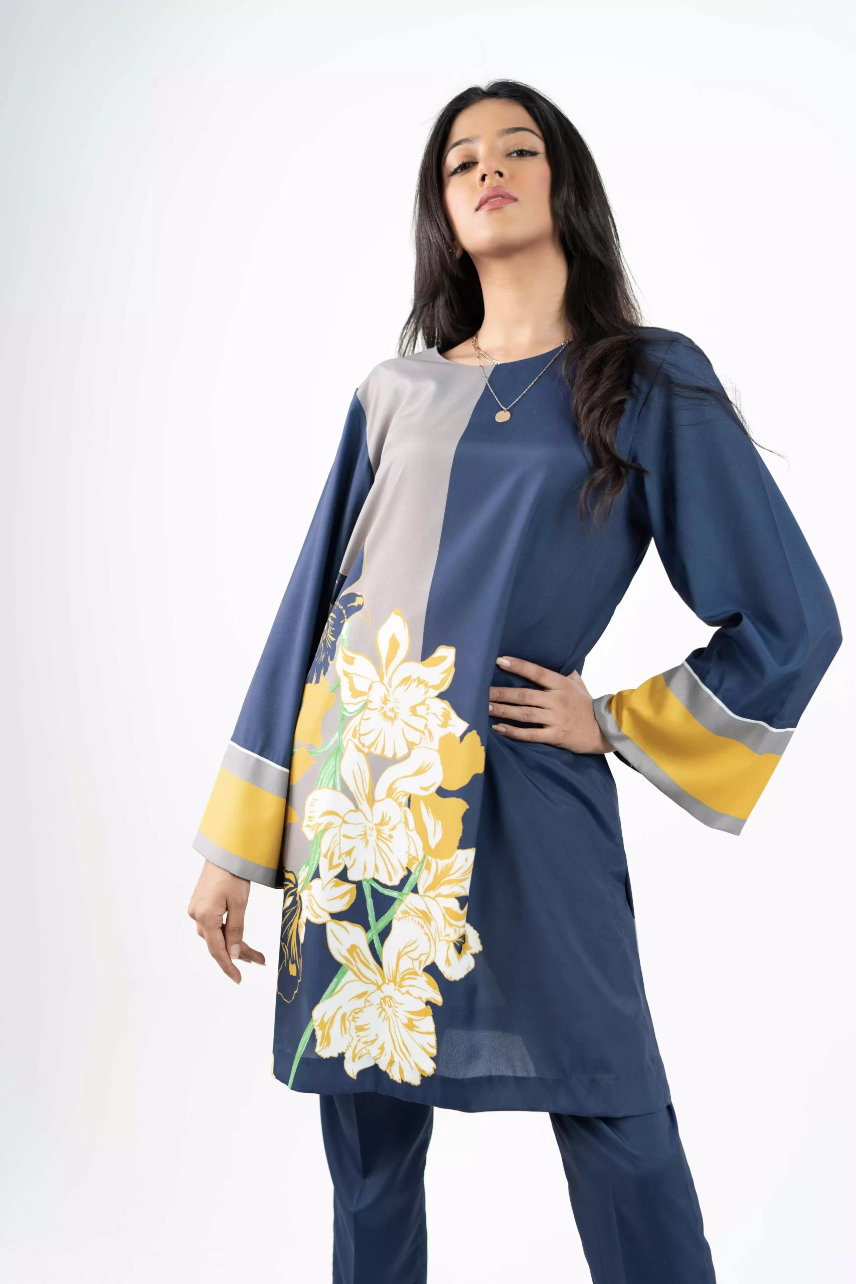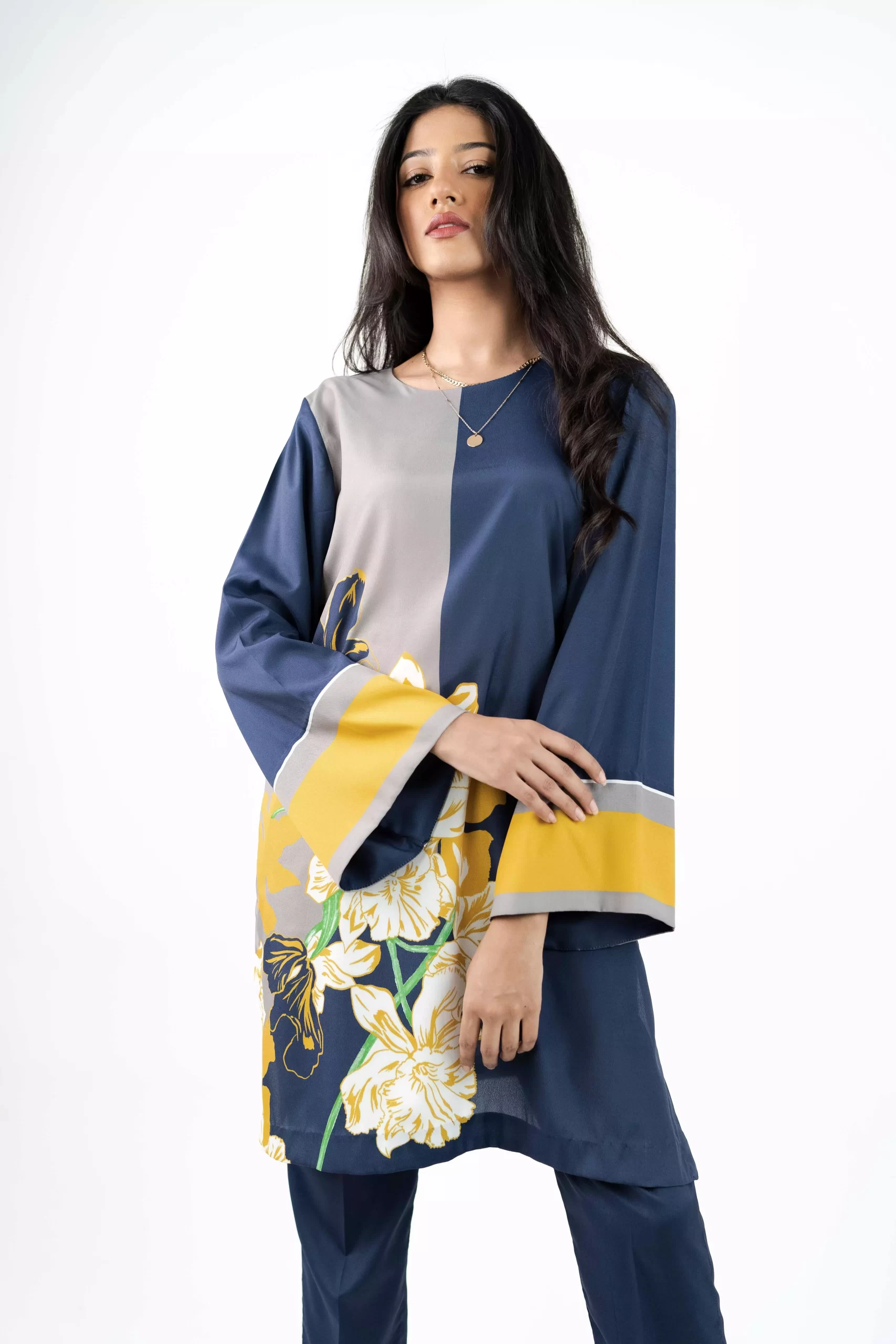 This color block printed floral top is made in Grip Silk fabric, with a crew neckline and side slit, can be paired with skinny pants.