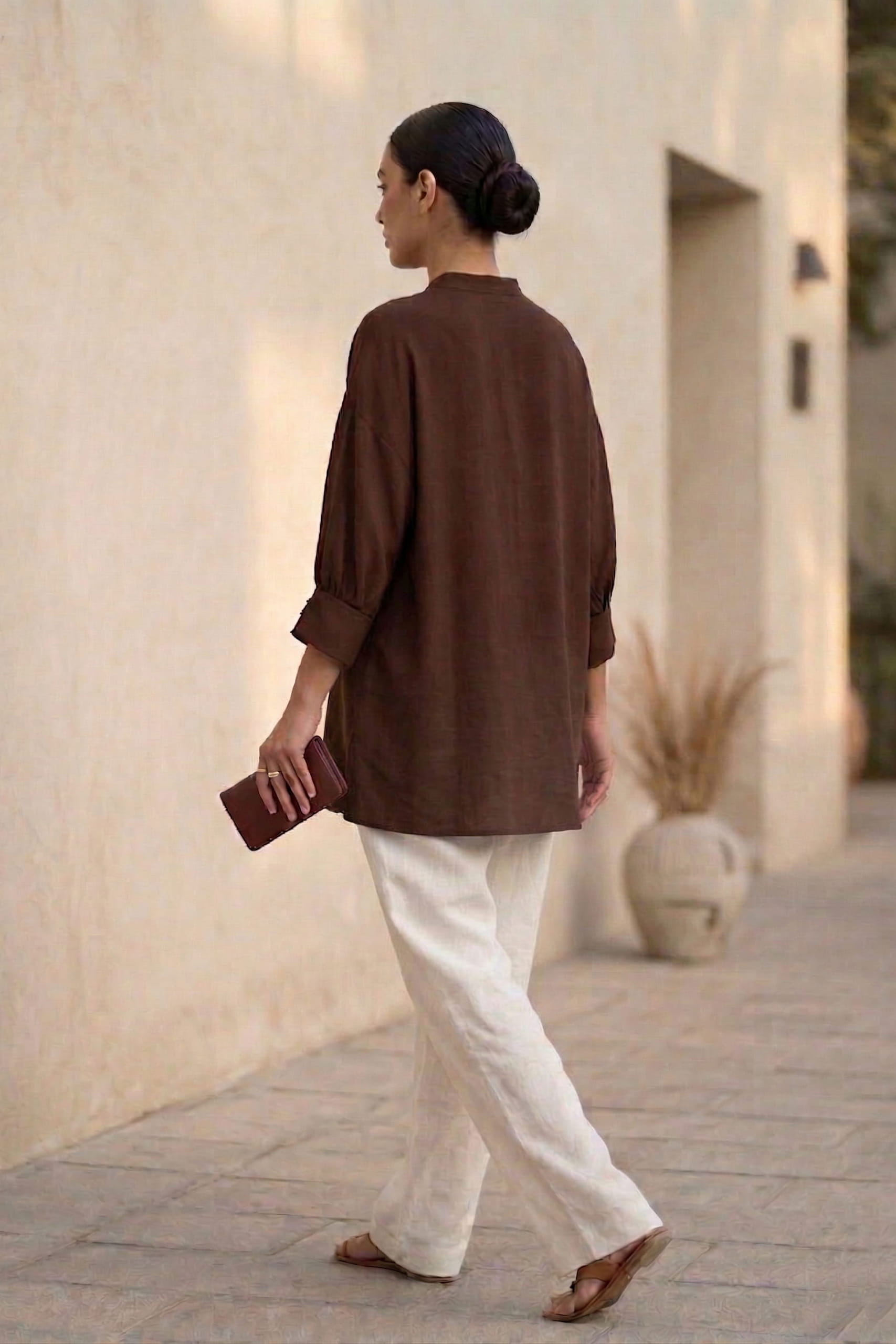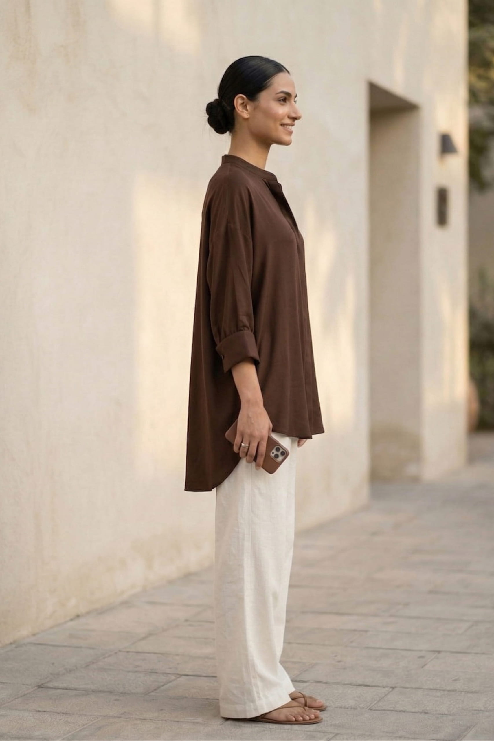 A Dusk Mandarin top, designed in a relaxed silhouette for effortless everyday wear. Crafted from Pure Butter Silk, it offers a soft, fluid drape with a lightweight, breathable feel. Finished with a modern high-low hem and subtle detailing, and back dart, this piece blends eastern elegance with a contemporary edge — perfect to style white or beige linen pants.