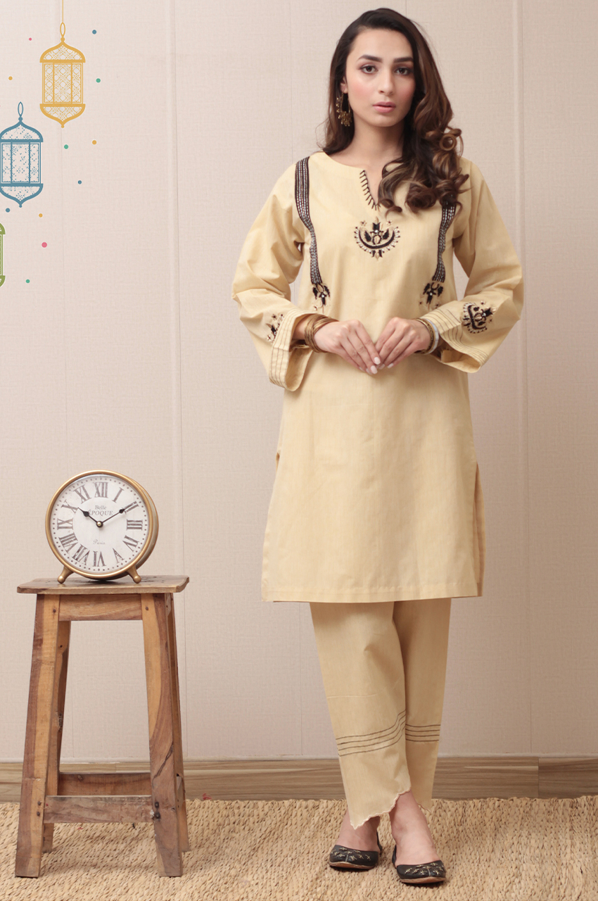 Oaked colored shirt with black gold and offwhite traditional embroidery on sleeves paired with matching skinny pants