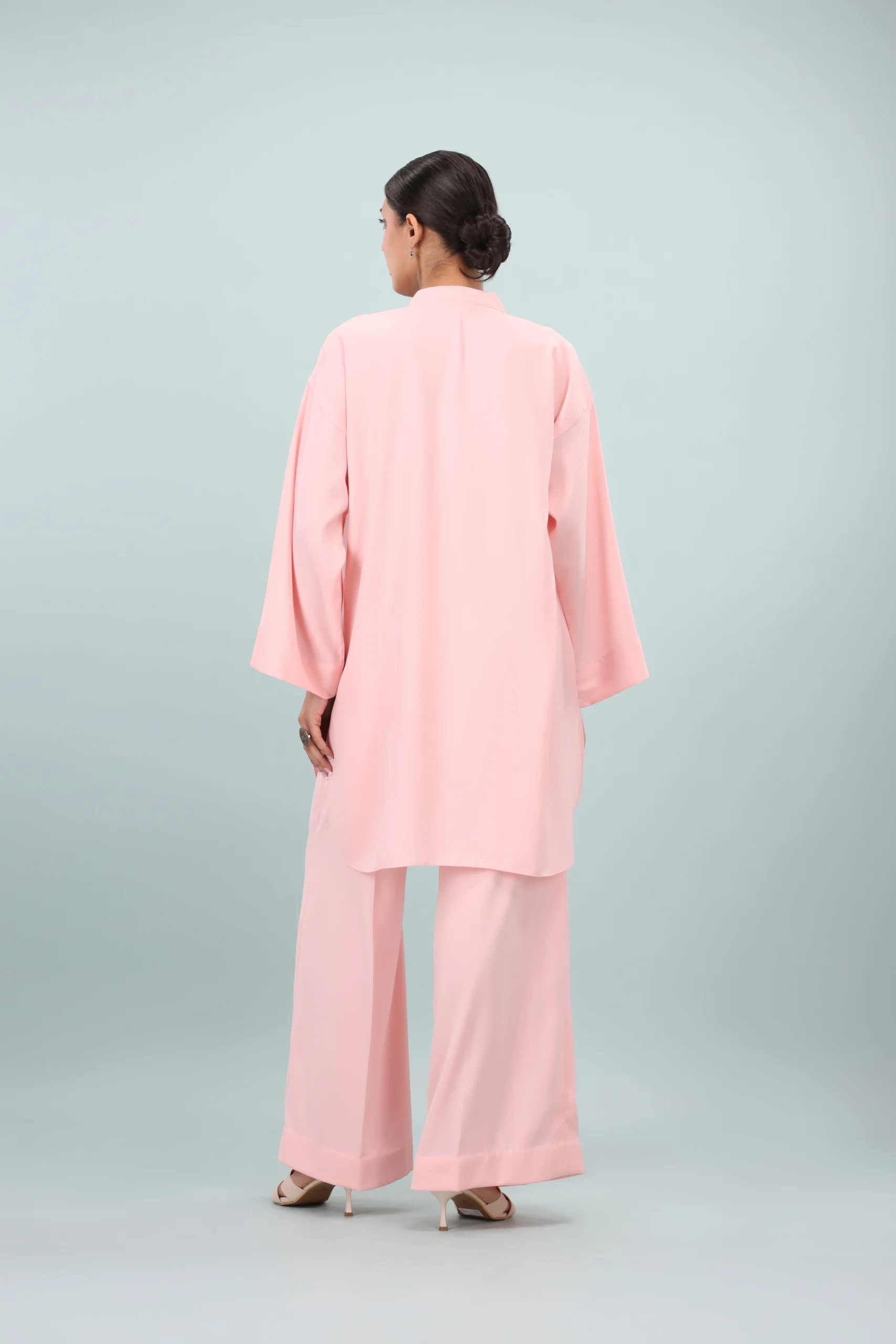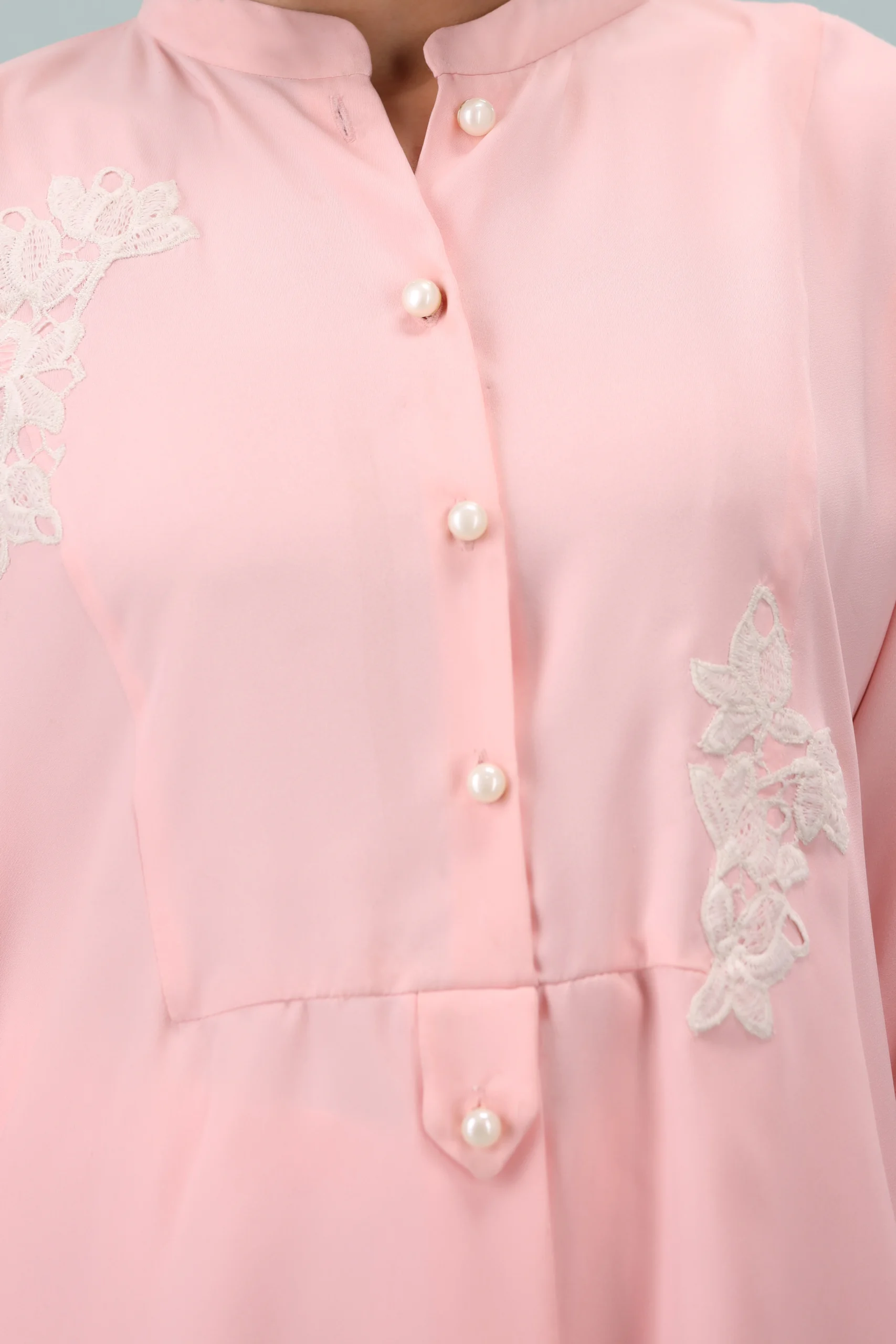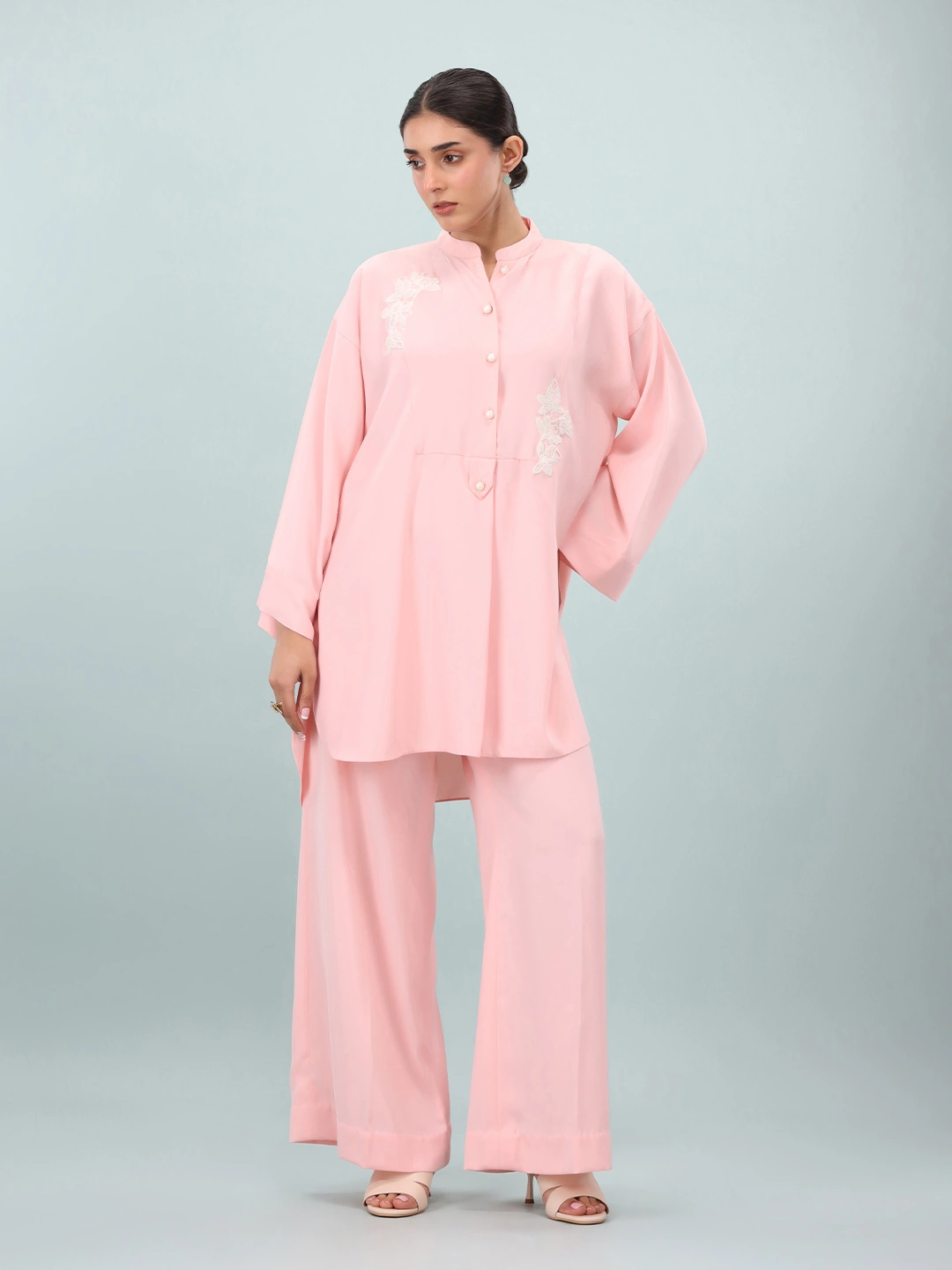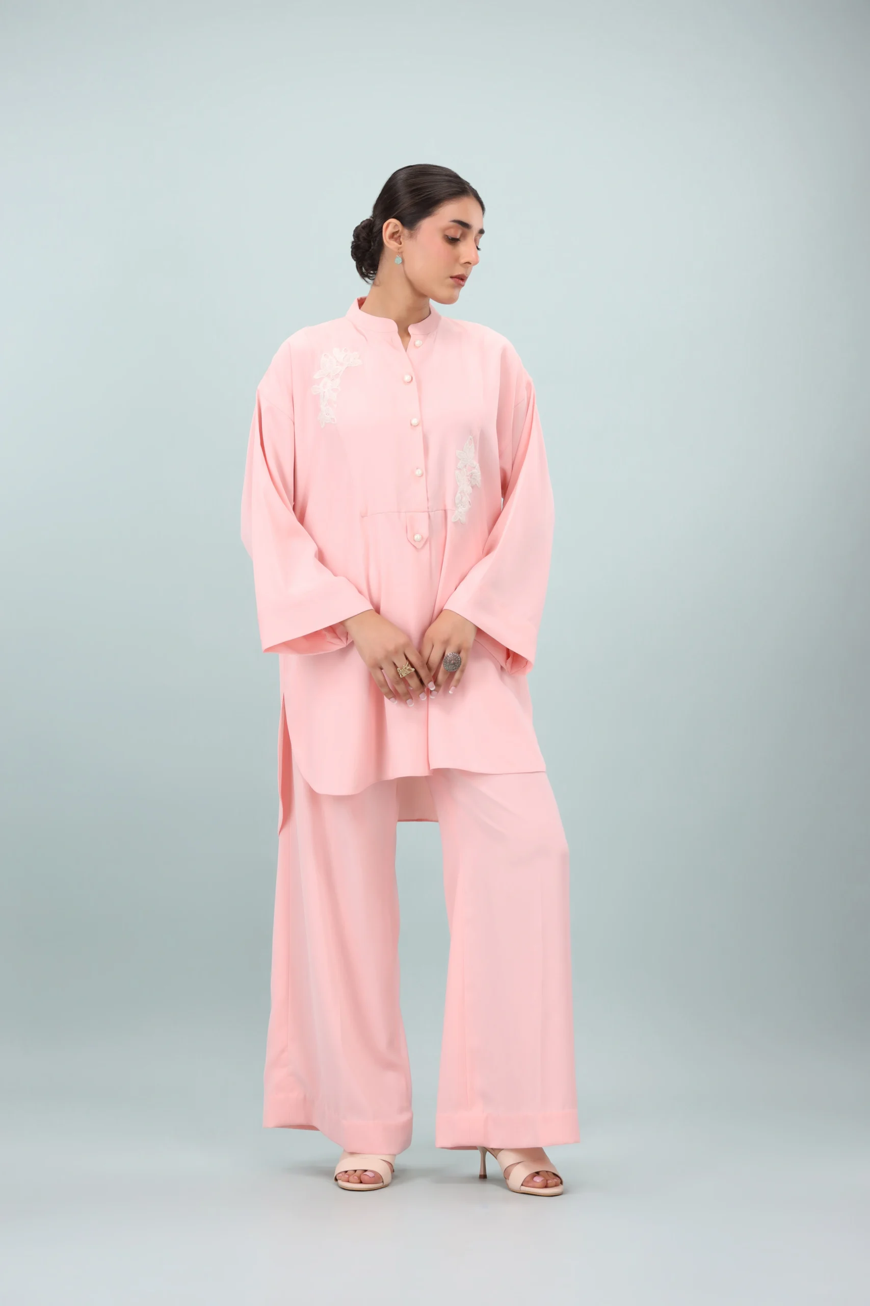 This charming powder pink co-ord set features a graceful, long-line tunic with a mandarin collar and a delicate button-down front. The shirt is elevated by intricate white floral lace embroidery on the bodice, adding a feminine and artisanal touch to the soft silhouette. Designed with wide sleeves and a high-low curved hem, it provides a relaxed yet refined drape for any daytime occasion.