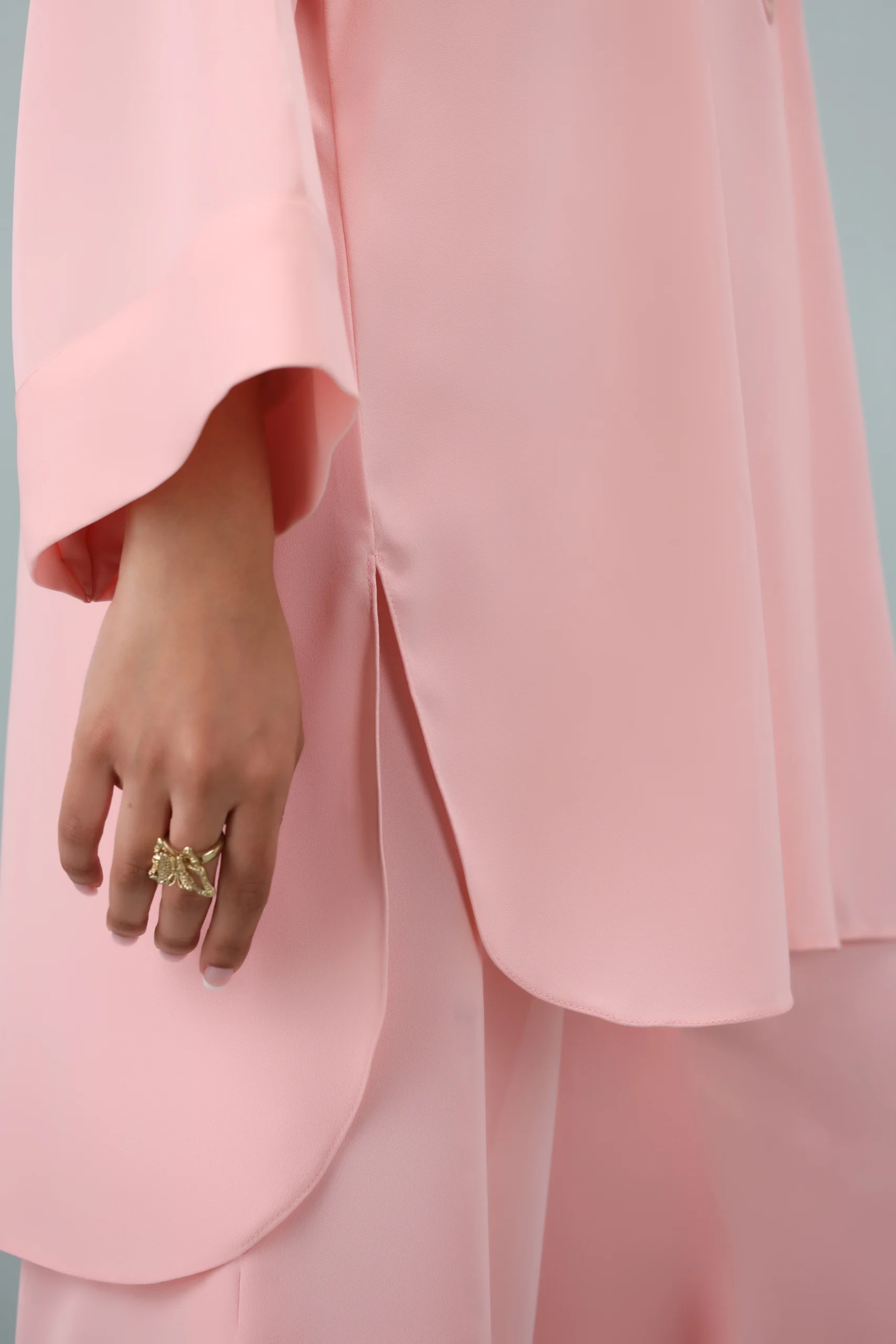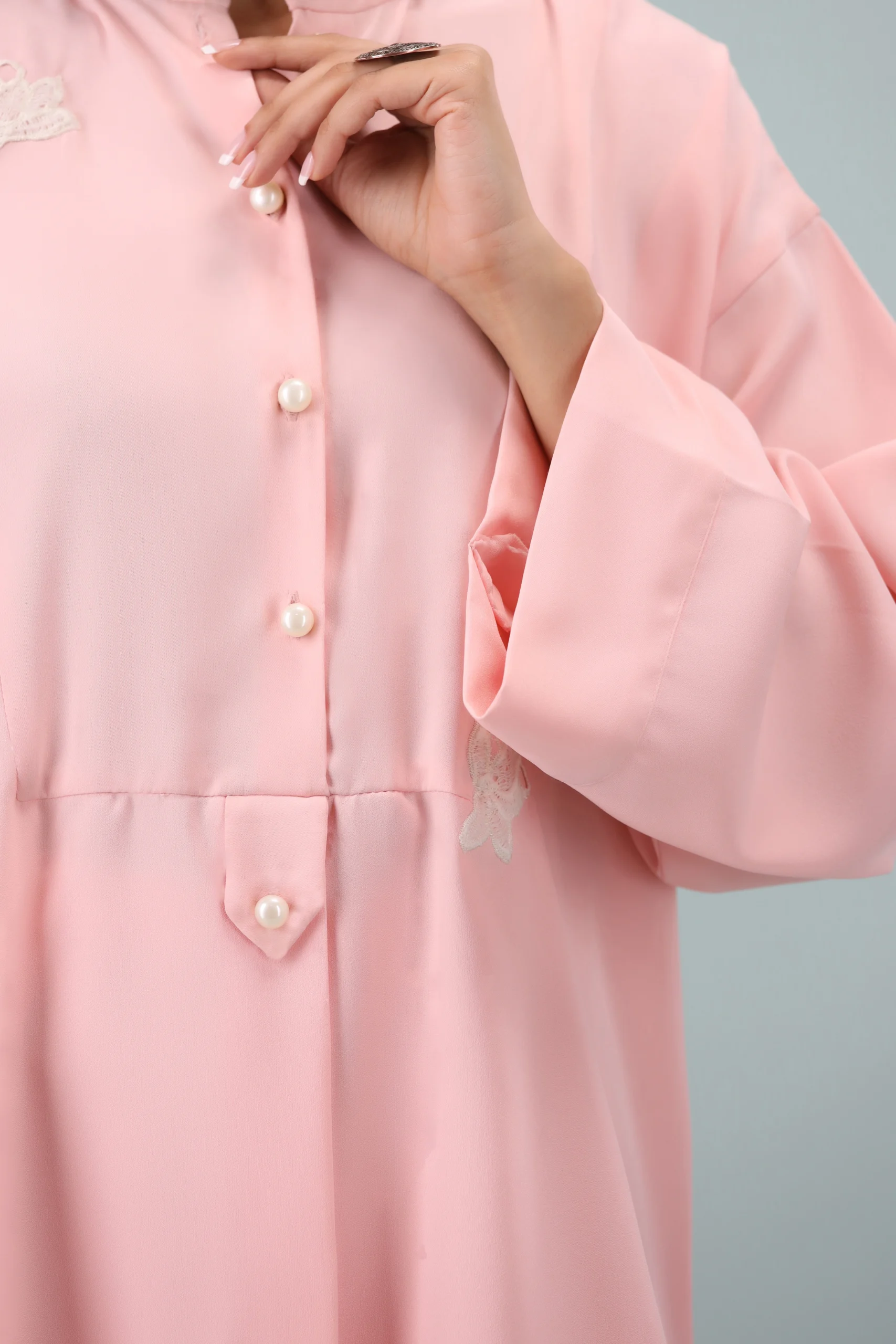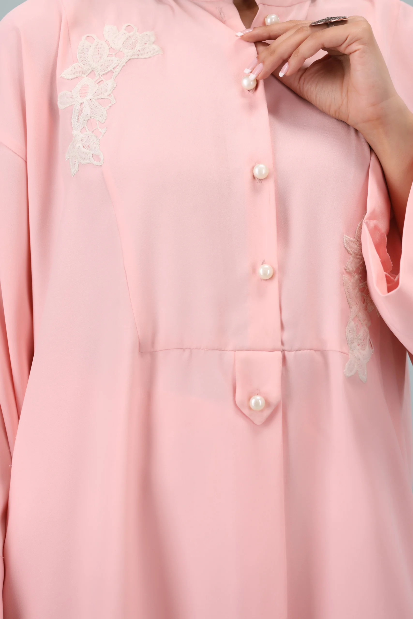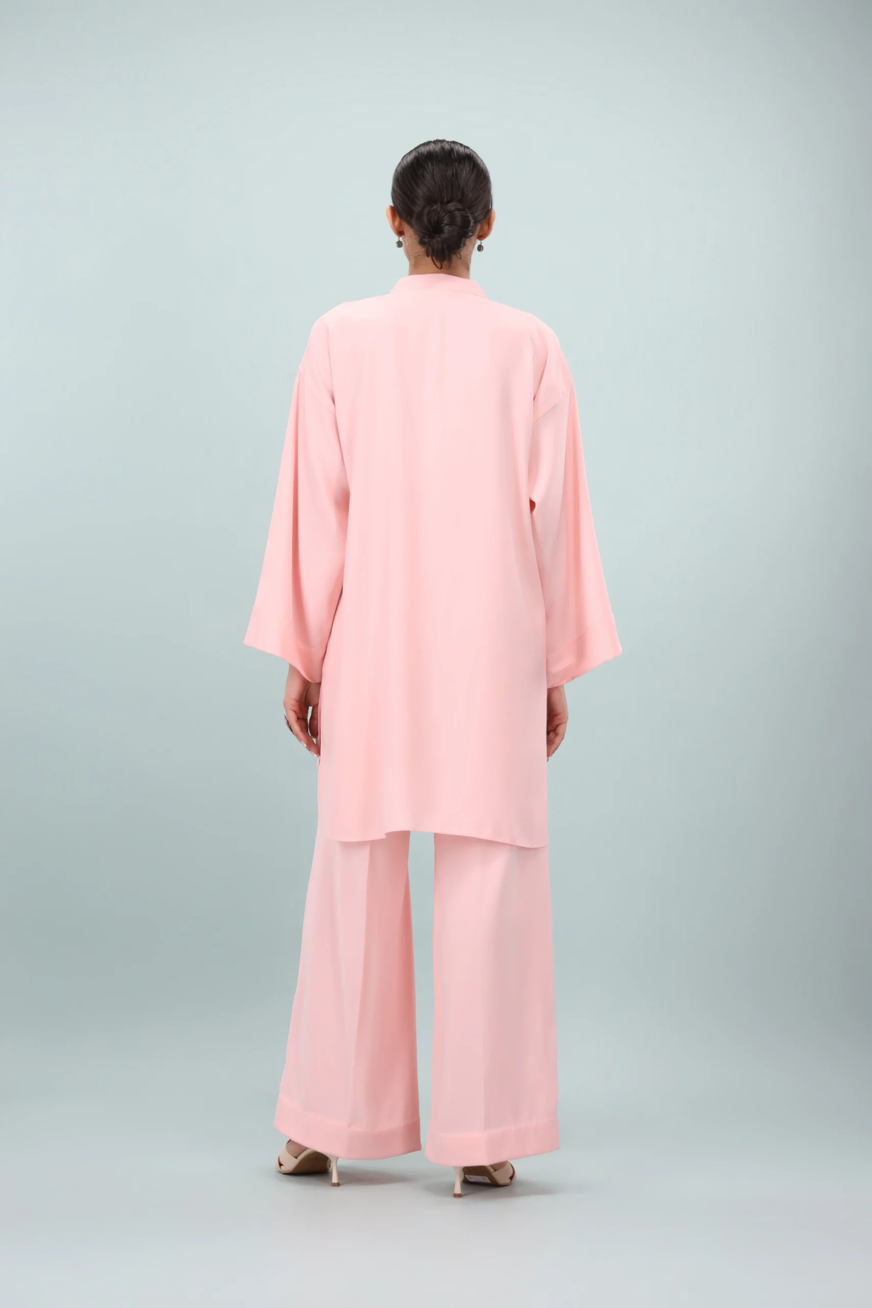 This charming powder pink co-ord set features a graceful, long-line tunic with a mandarin collar and a delicate button-down front. The shirt is elevated by intricate white floral lace embroidery on the bodice, adding a feminine and artisanal touch to the soft silhouette. Designed with wide sleeves and a high-low curved hem, it provides a relaxed yet refined drape for any daytime occasion.