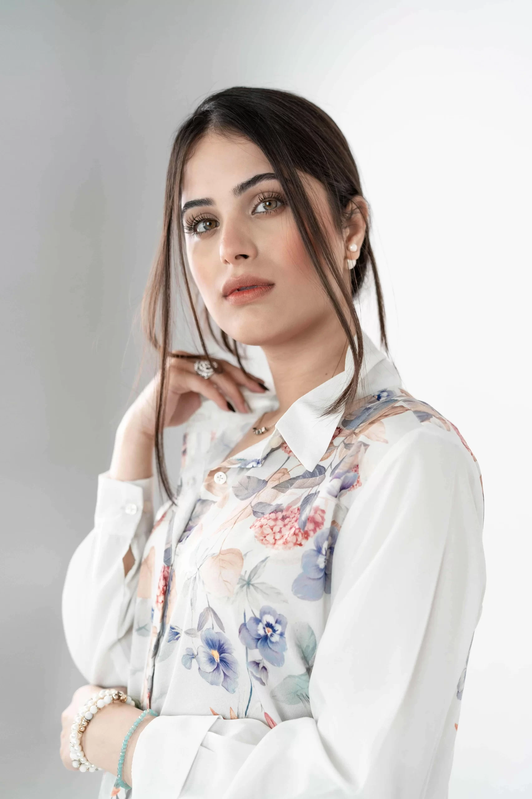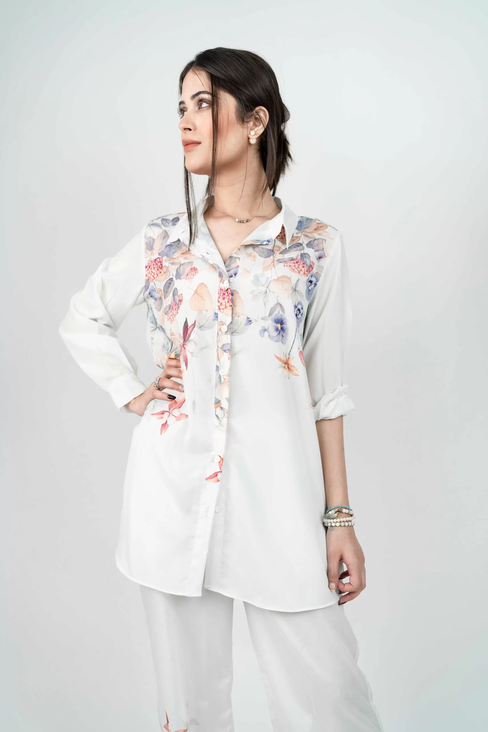 This buttoned-down blouse is made in Grip Silk fabric in floral Print. It is paired with matching printed floral pants. Blouse is a front open blouse with collar and side slit.