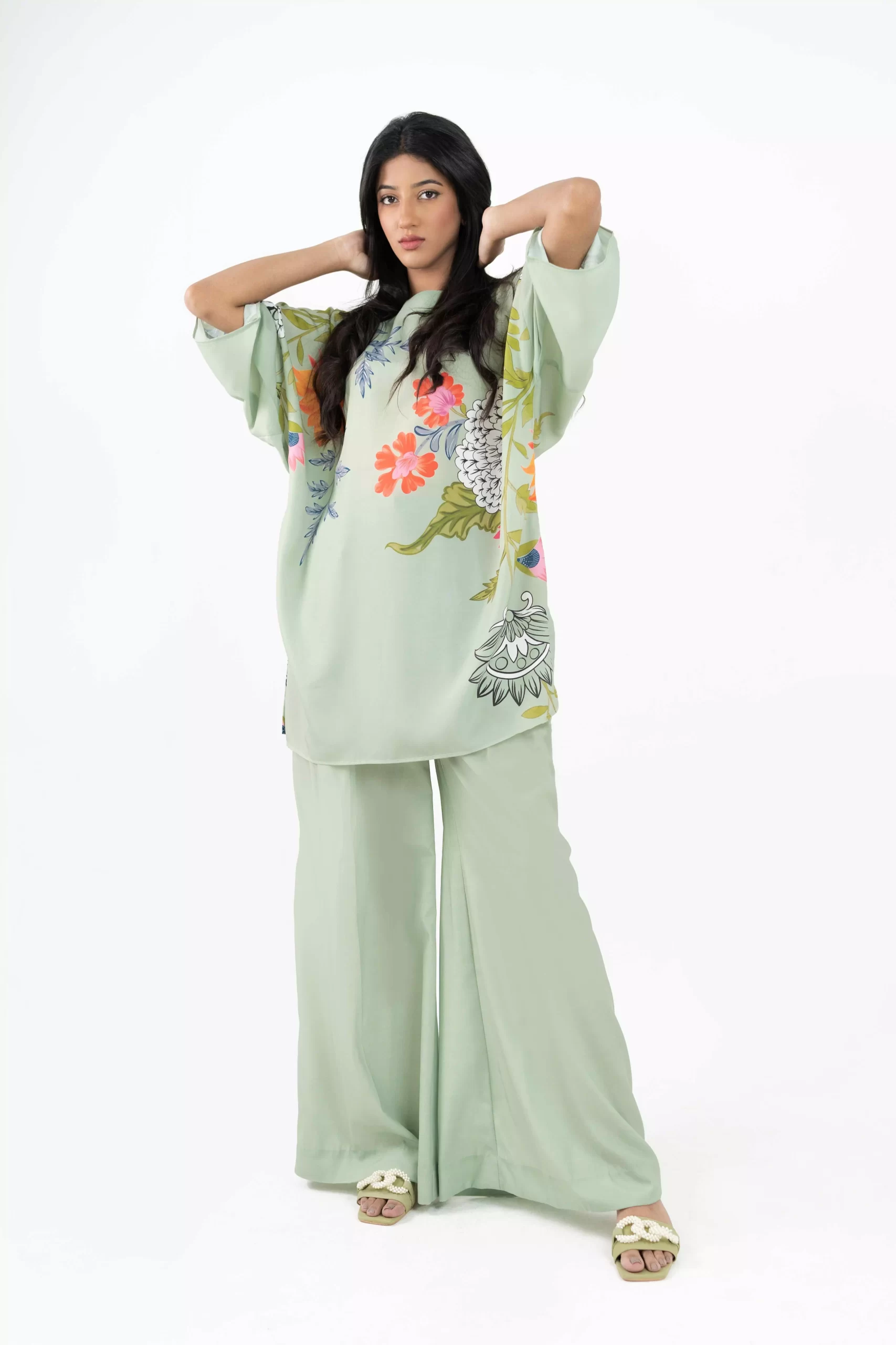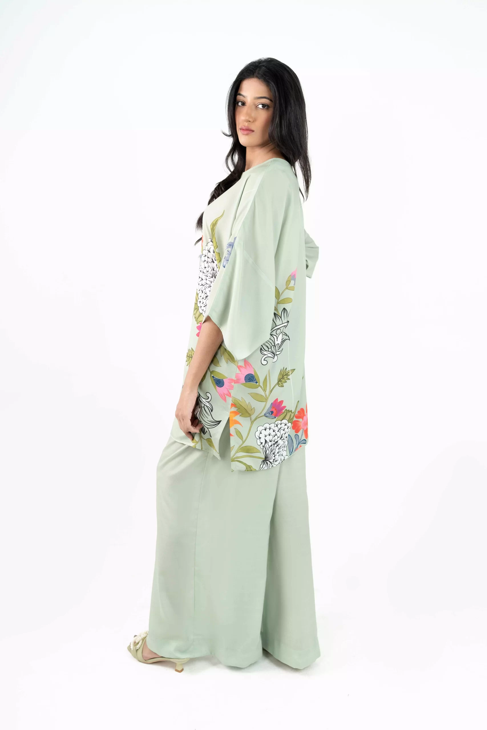 This green top is made in Grip Silk fabric with multi color floral print, side slit and round hem. Can be paired with flowy matching plain colored pants