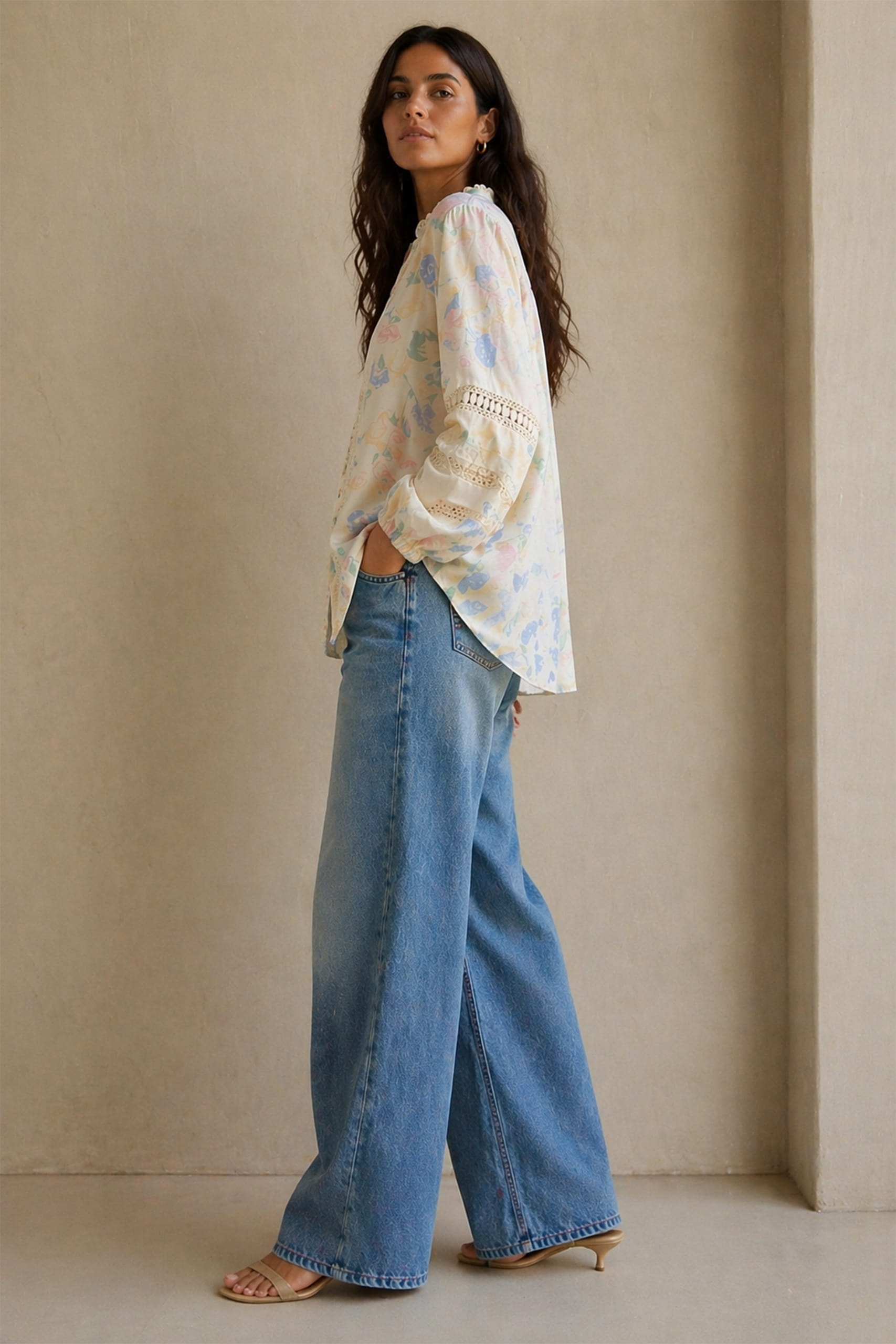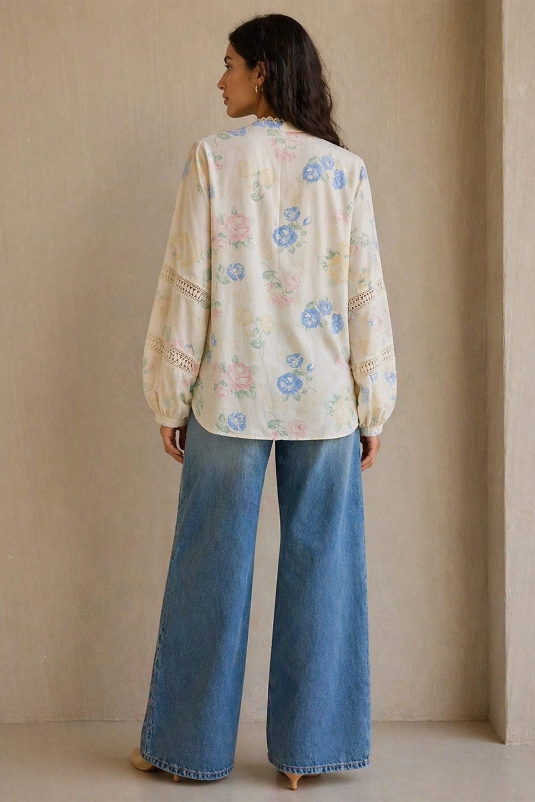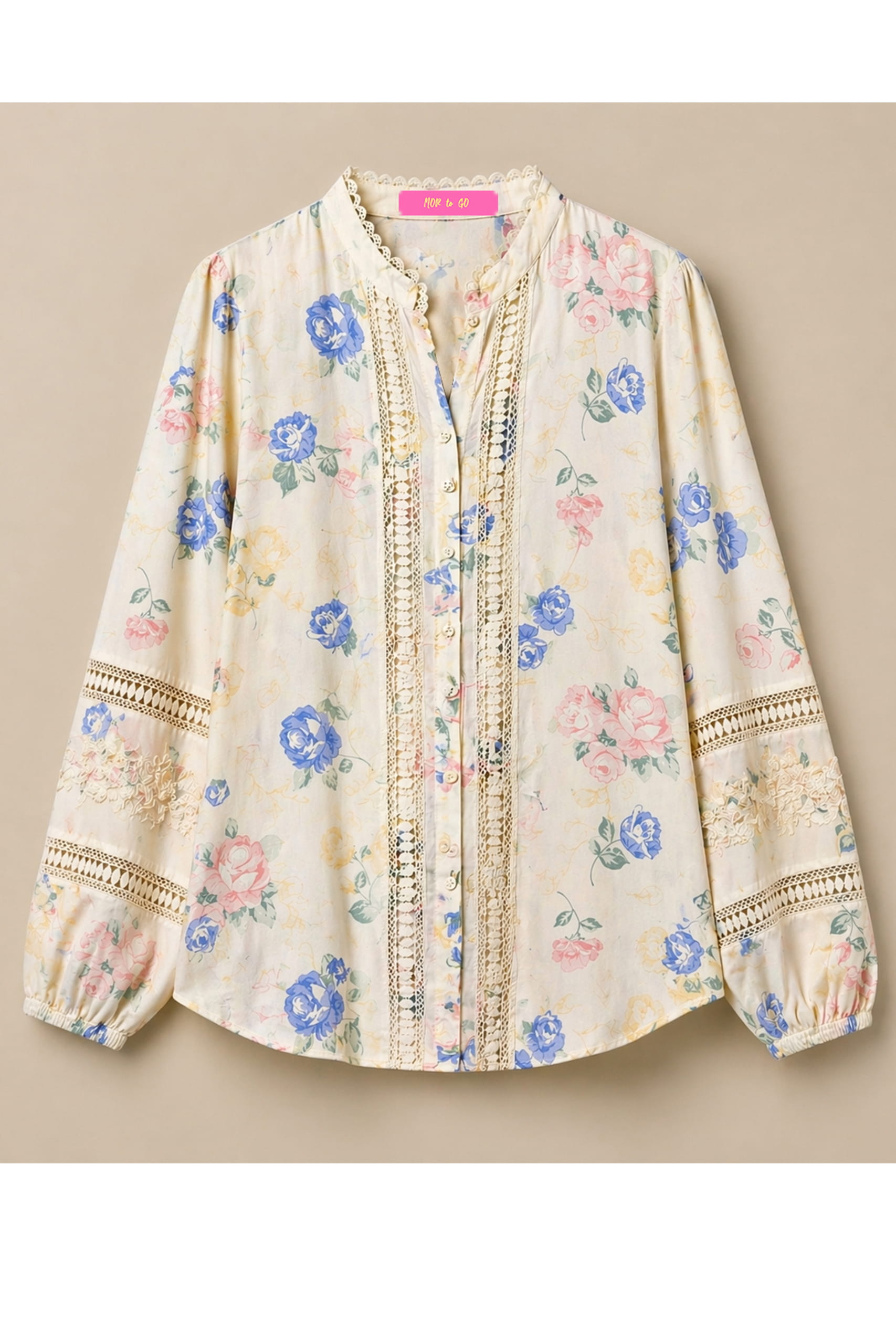 A soft statement piece designed for effortless elegance. This floral blouse blends delicate pastel prints with intricate lace detailing, giving it a timeless, feminine edge. The relaxed silhouette, paired with airy fabric and subtle crochet accents, makes it perfect for everyday wear while still feeling elevated. The scalloped neckline and detailed sleeves add just the right amount of vintage charm without being overdone.