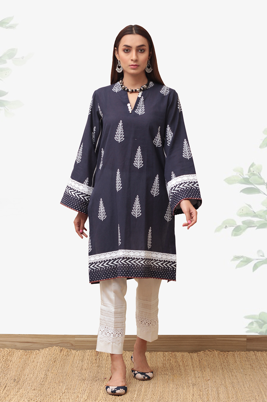 A dark blue khadi cotton kurta with hand blocked front and back, detailed with hand blocked borders and lace on the daaman and sleeves with maroon piping can be paired with a lace detailed lace trouser