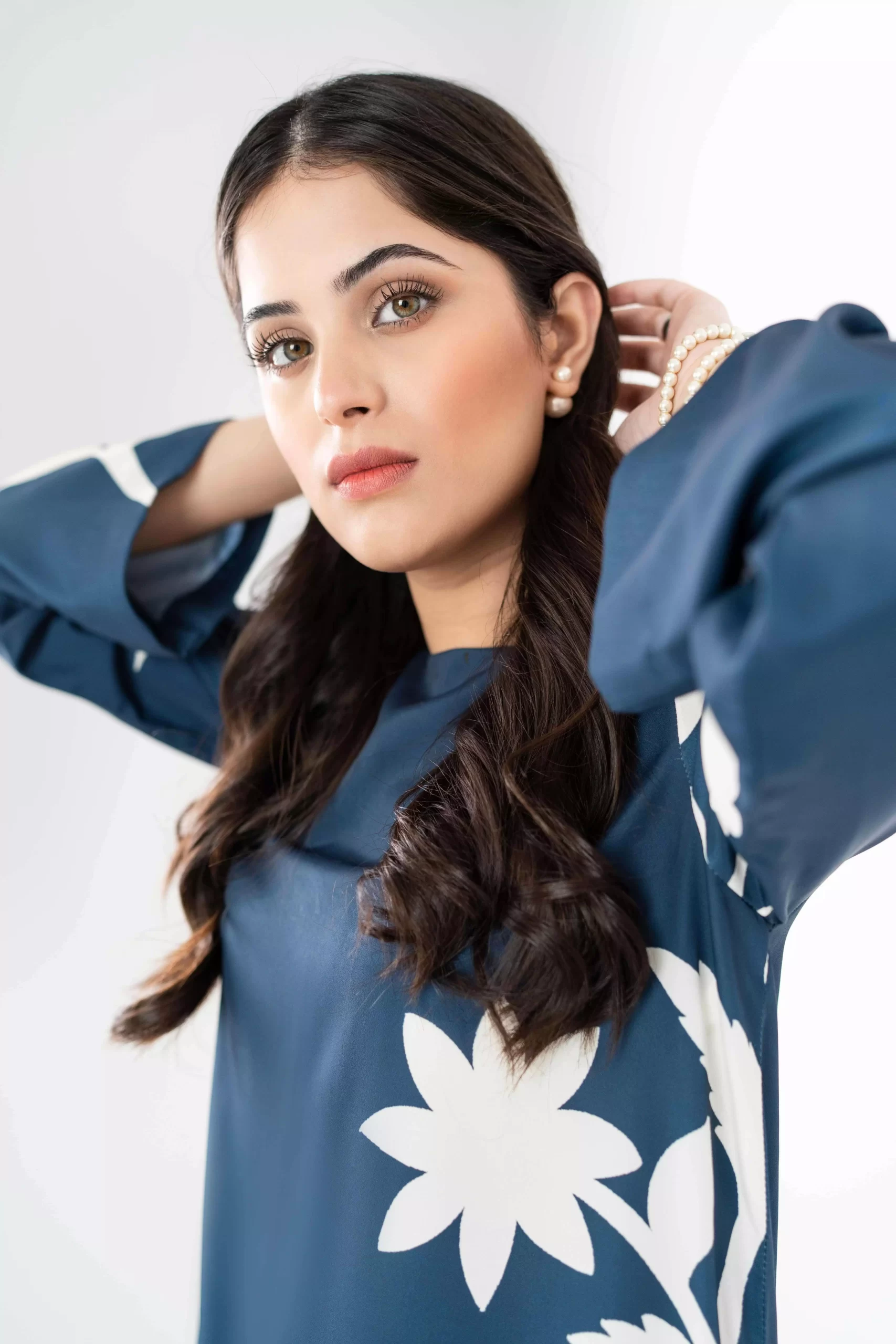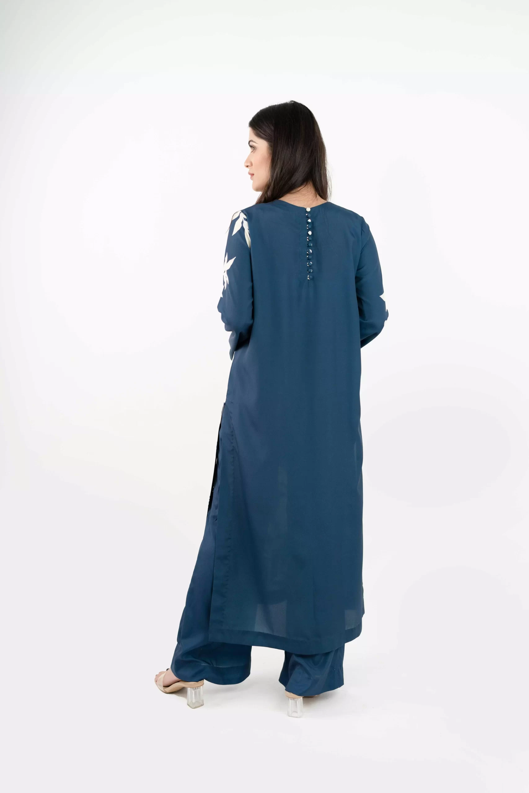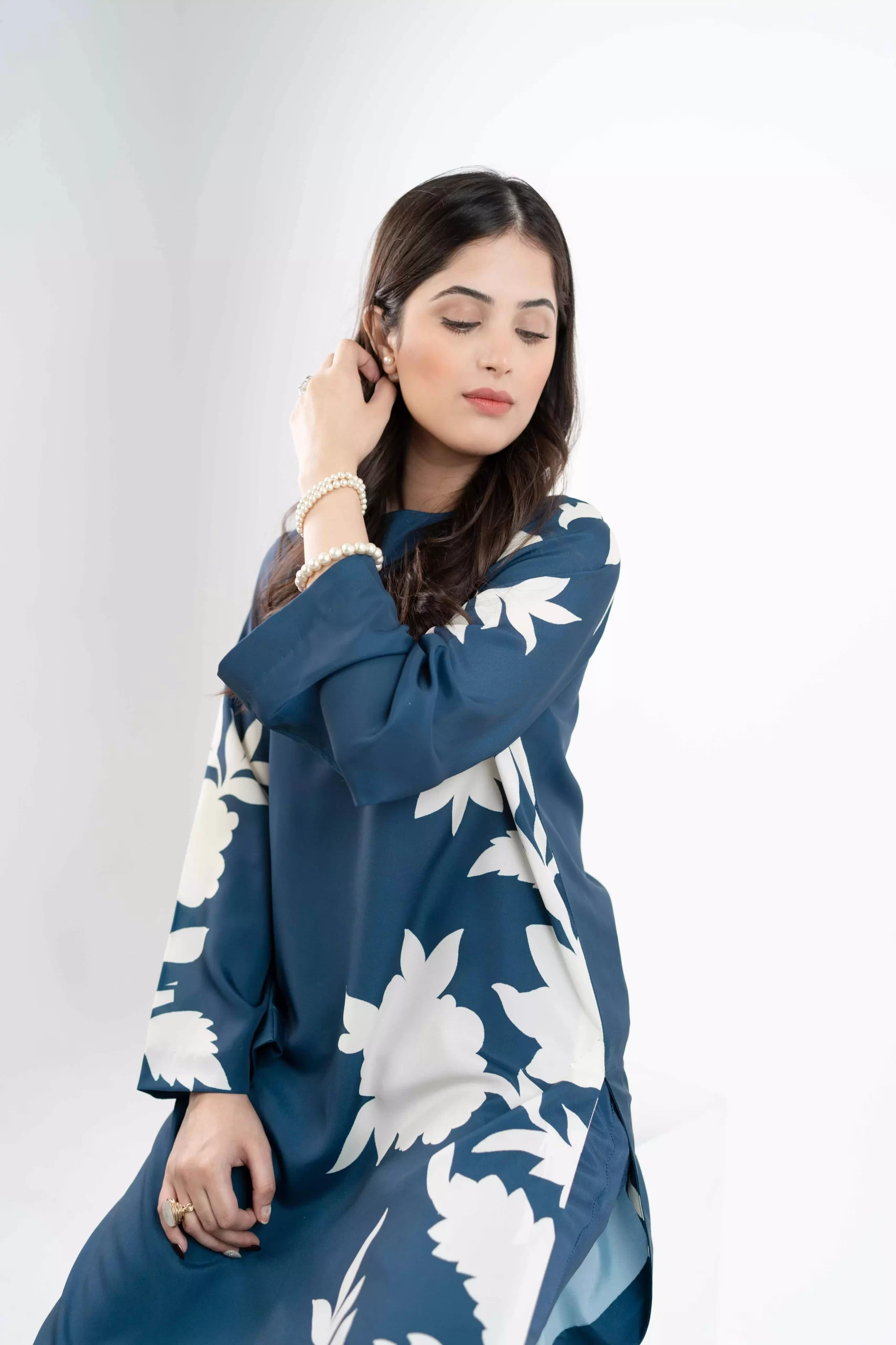 This Navy blouse long shirt is made in Grip Silk fabric in floral print with a crew neckline and a side slit, can be paired with a plain same colored trouser.