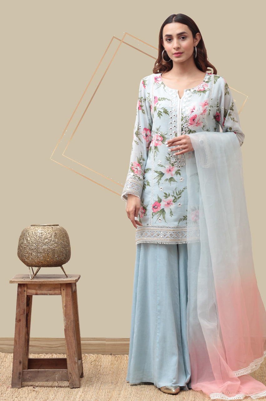 Handwork sheesha and pearls , with chicken kaari lace on a printed lawn shirt, with festivity written all around paired with a sharara pants and an organza two toned dupatta.