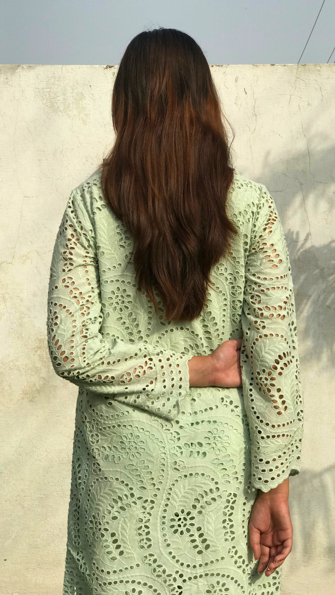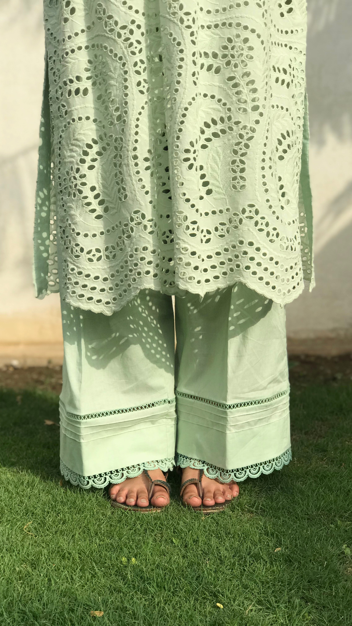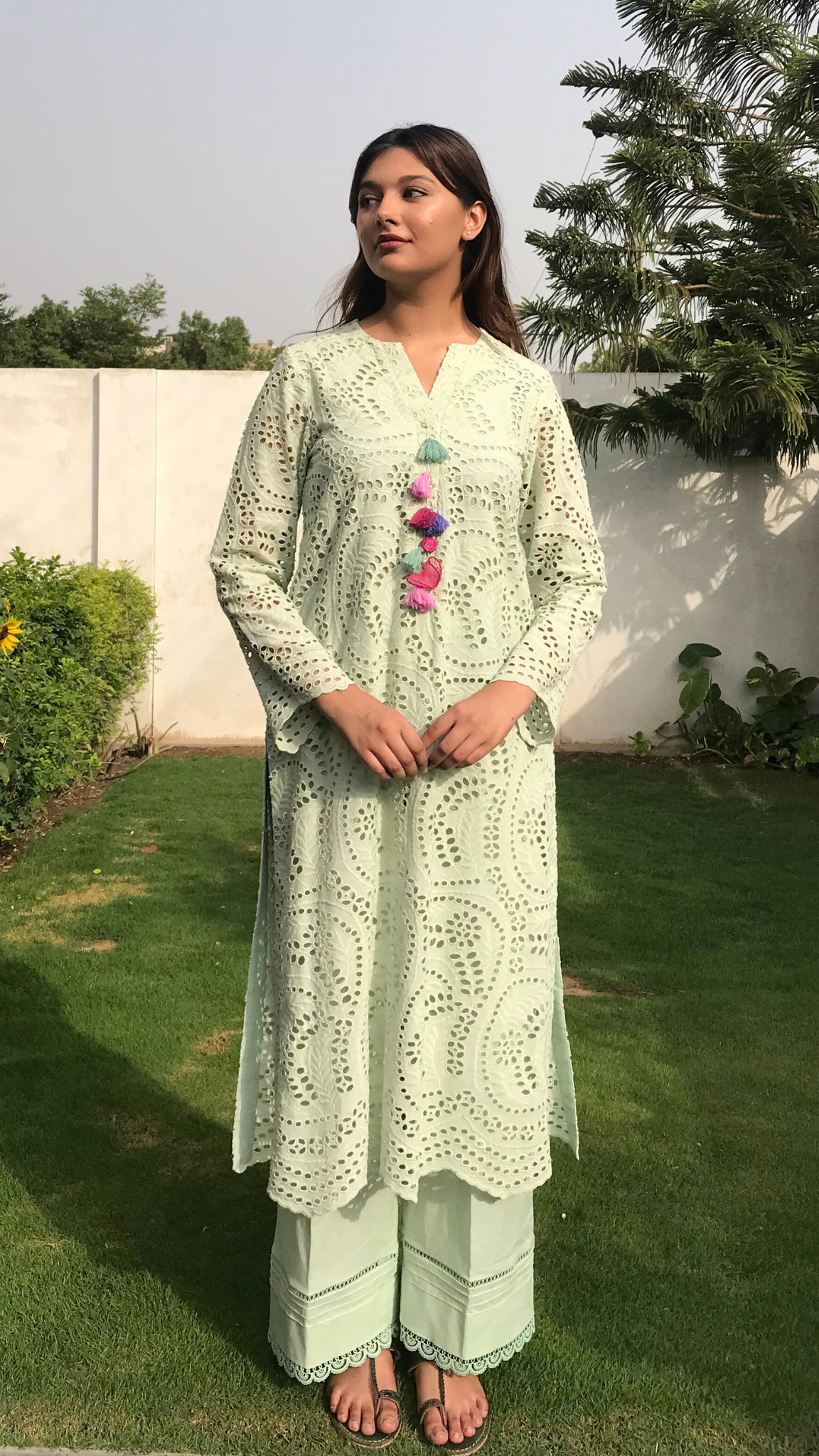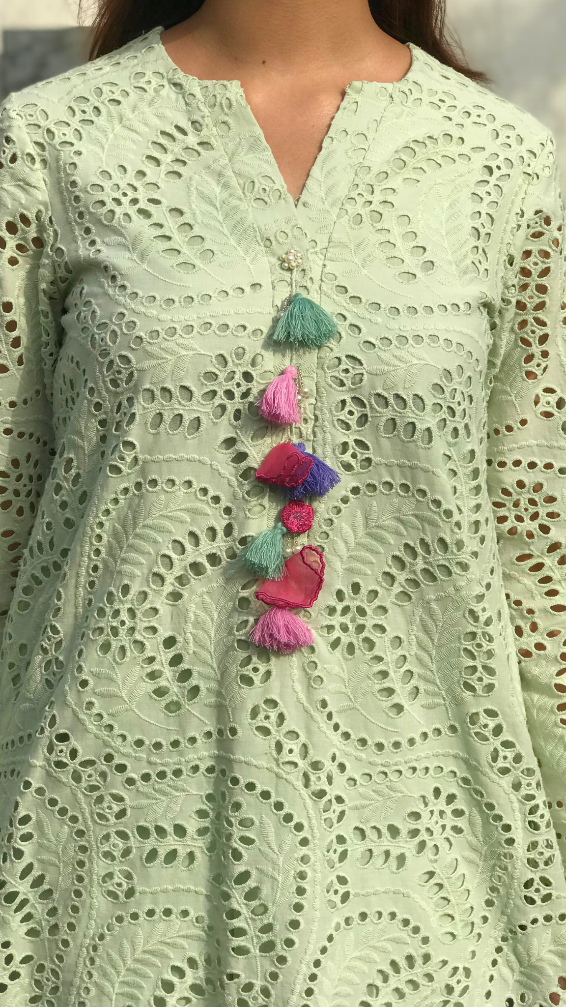 Breathe freshness into your wardrobe with this soothing mint green kurta set. The kurta adorned with playful multicolored tassels for a vibrant touch. Paired with straight pants featuring lace detailing at the hem, this ensemble strikes the perfect balance between comfort and charm — ideal for daytime gatherings or summer.