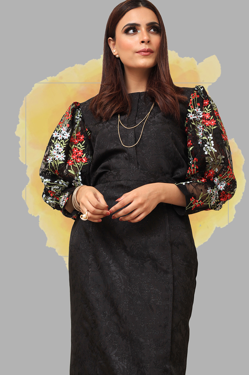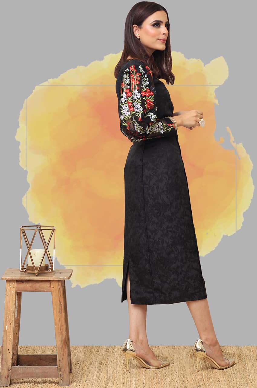 A nicely stitched brocade fabric long skirt paired with a brocade top with embroidered sleeves.
