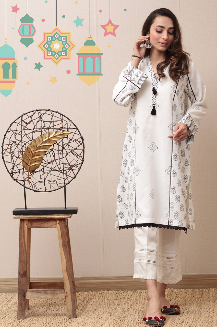 Hand blocked lawn karanda shirt, finished with laces, sheesha and anchor buttons on neckline