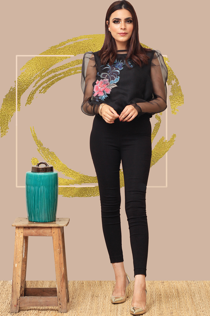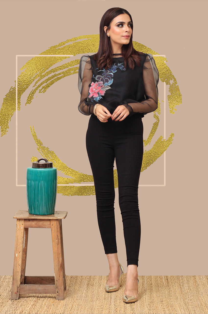 Nicely stitched organza top with a floral patch, with lining.