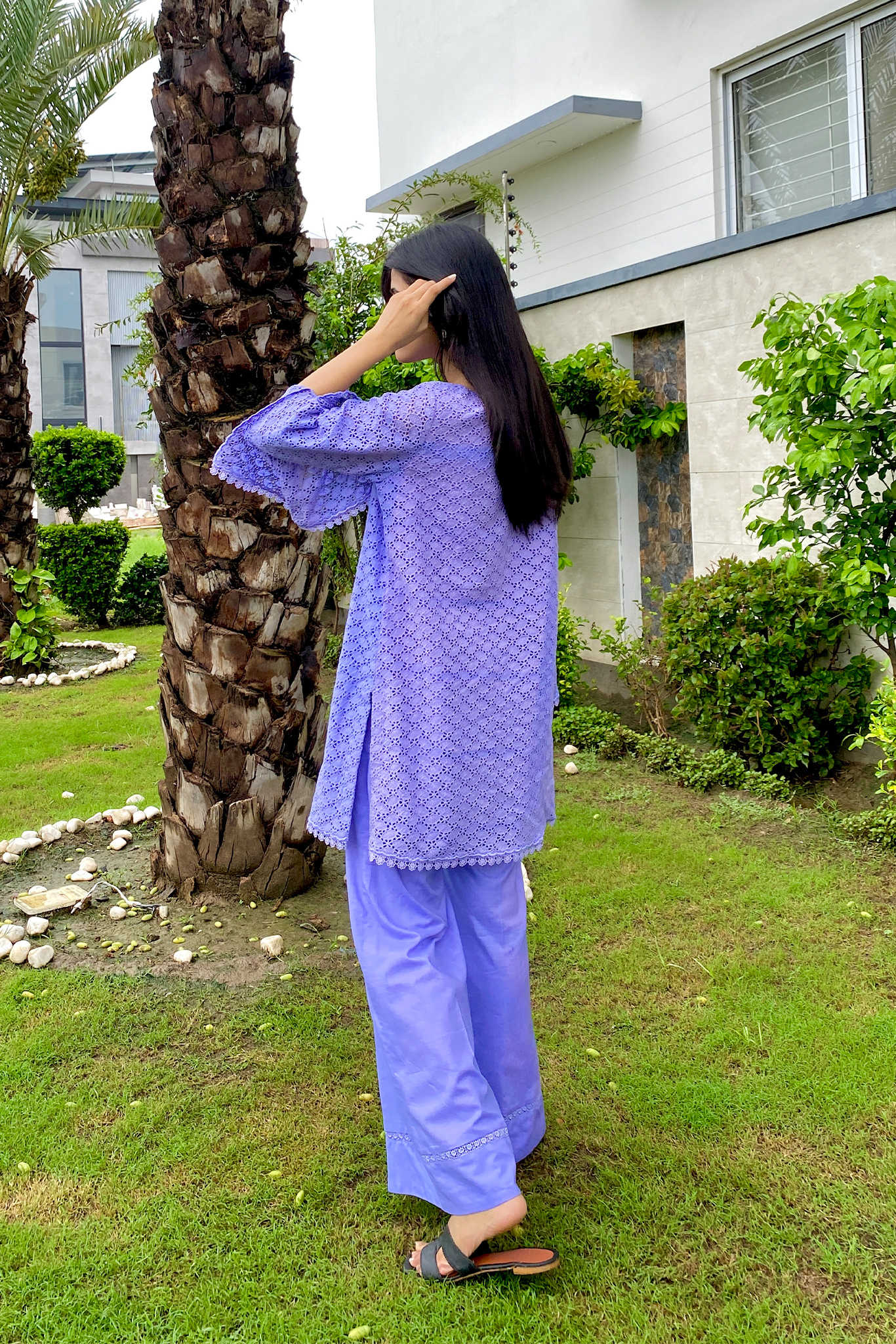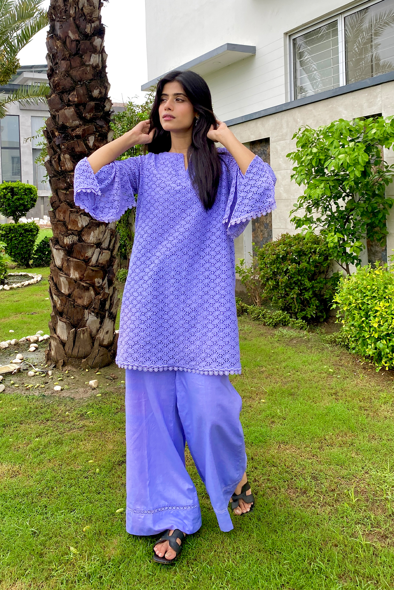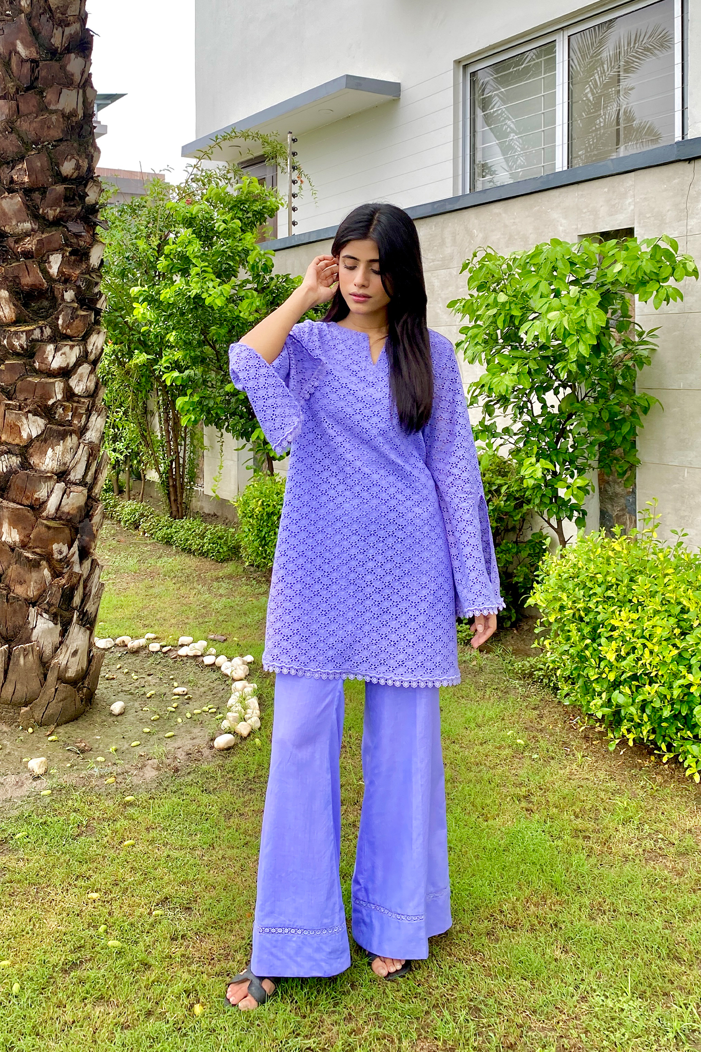 Radiate soft charm with our Periwinkle Dream Kurta Set, a breezy ensemble perfect for warm days and effortless style. The kurta is crafted in a calming periwinkle hue, featuring flared sleeves and scalloped lace detailing that adds a delicate finish. Paired with wide-leg trousers that echo the same tonal elegance, this set is designed for comfort without compromising on grace. Whether you’re heading to a casual lunch or enjoying a weekend unwind, this look speaks pure summer serenity.