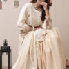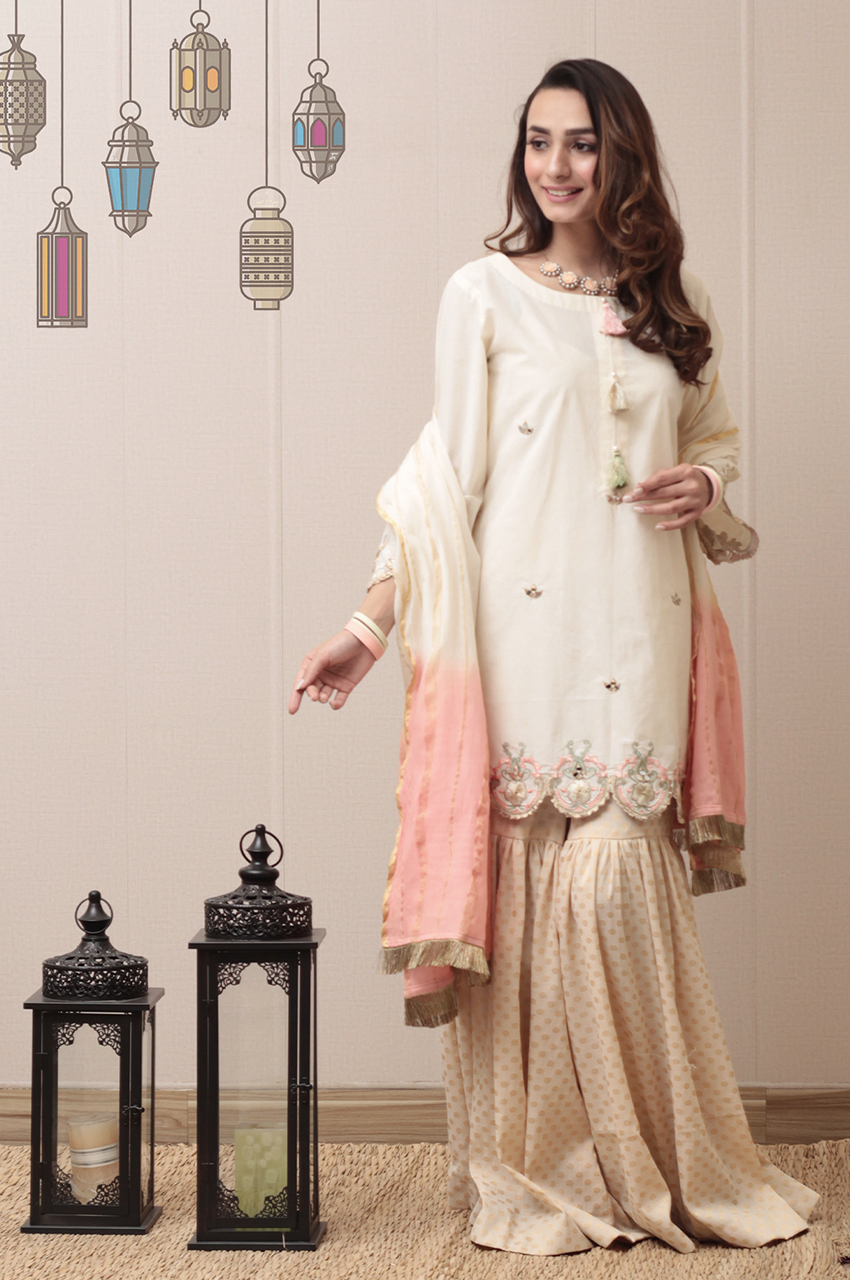 Lawn kurti with embroidered resham and sheesha work on hem and sleeves with summer friendly hues paired with polka dot gharara