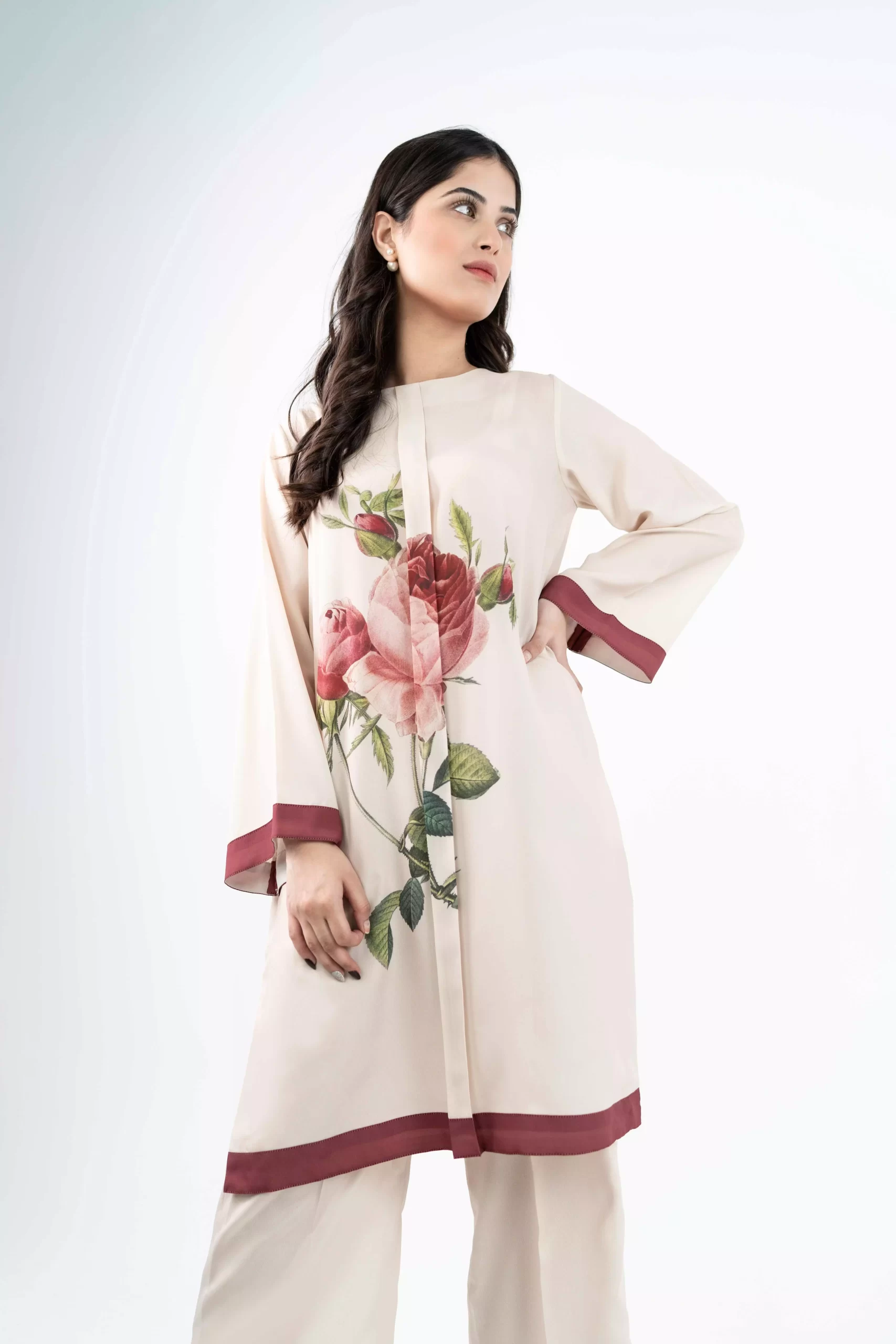 This beige top is made in Grip Silk fabric with central pleat and a floral centre print with loose sleeves can be paired with matching plain colored culotte pants.