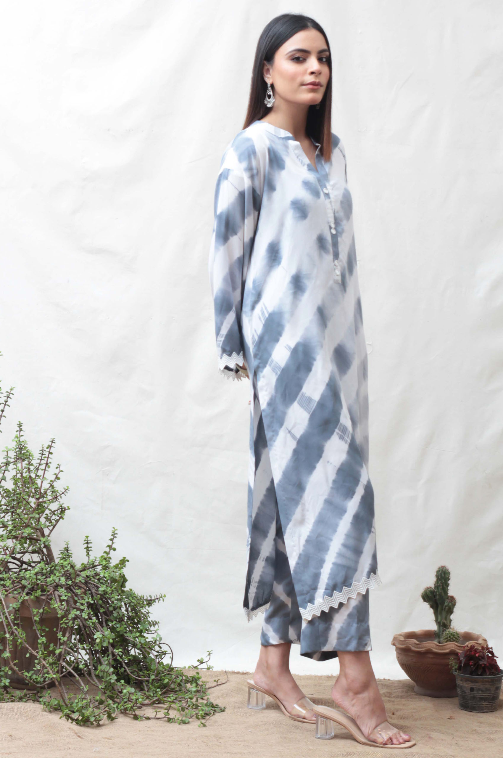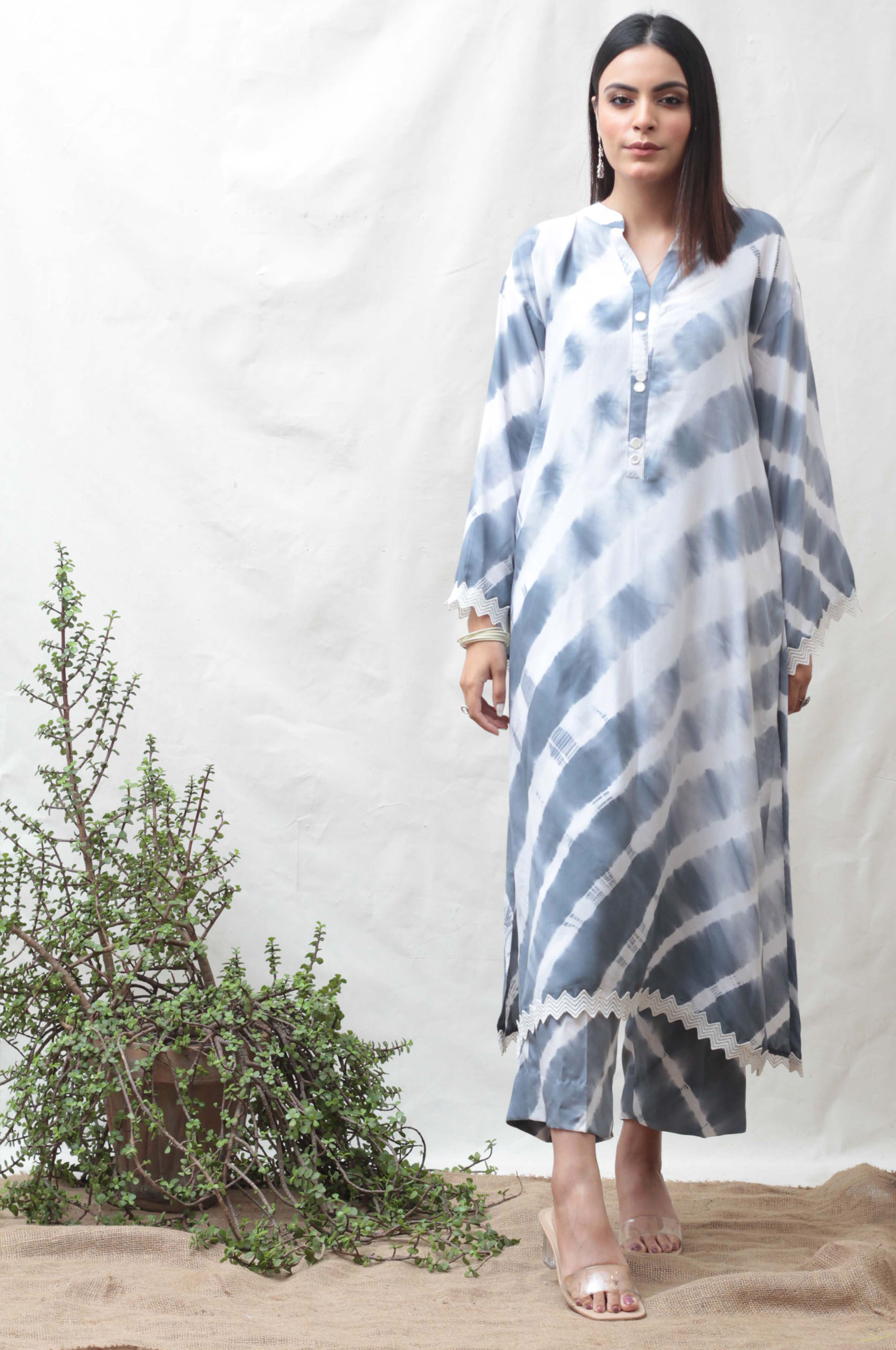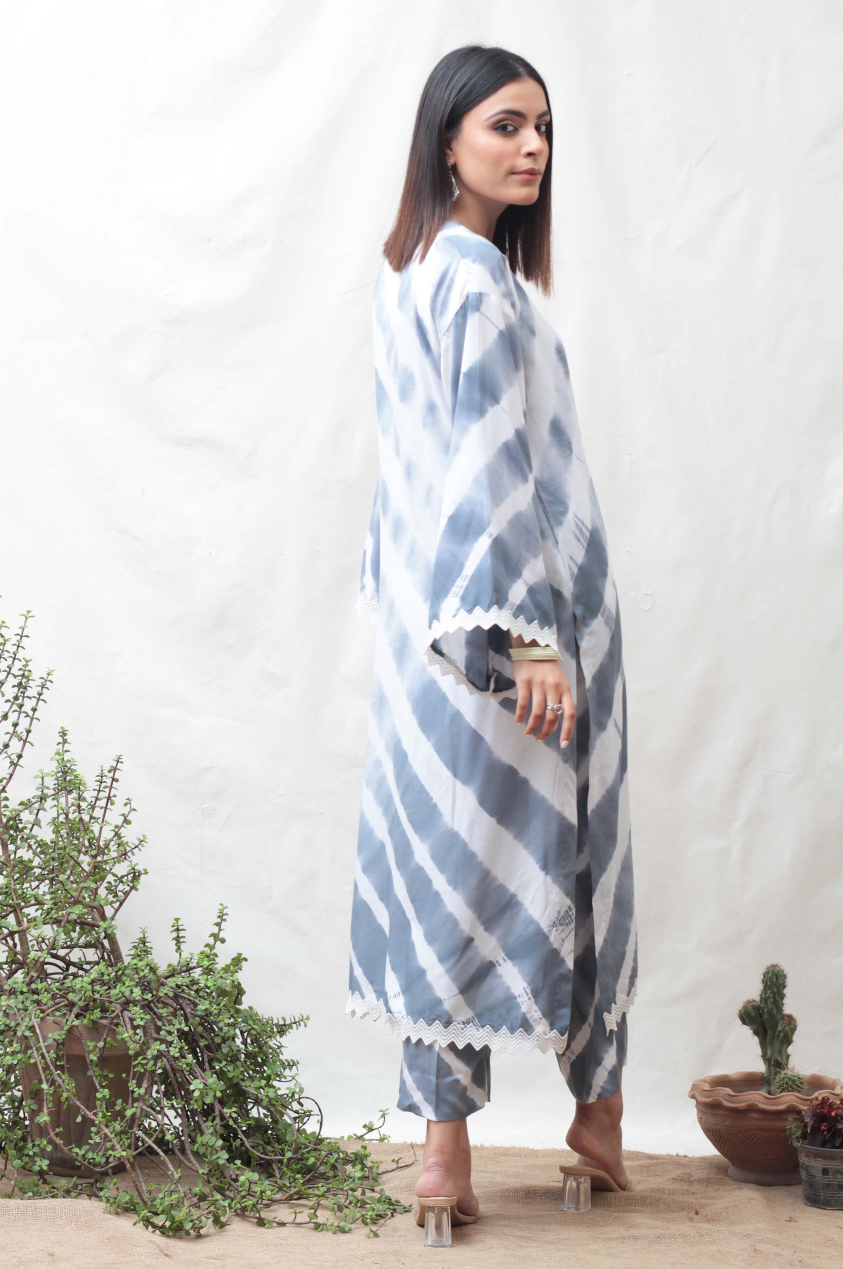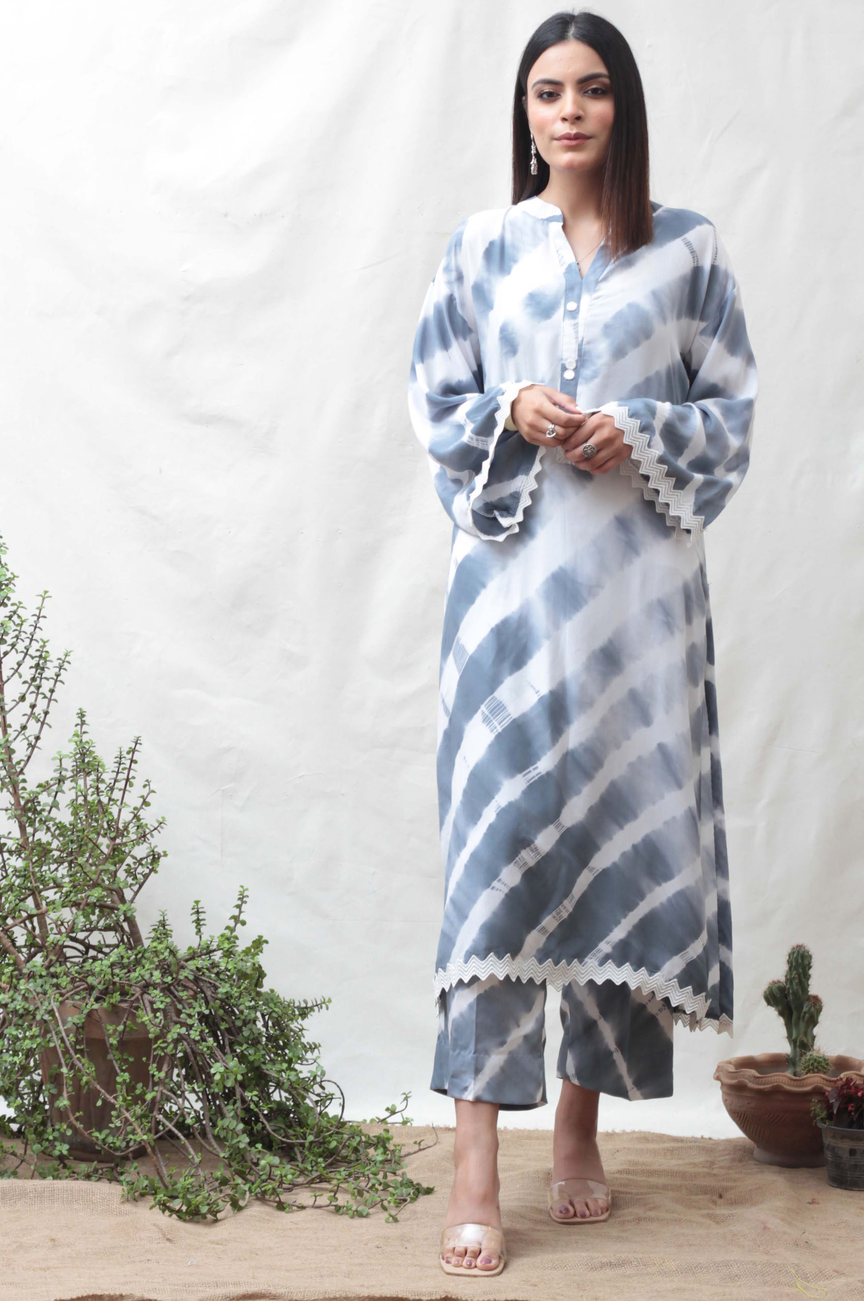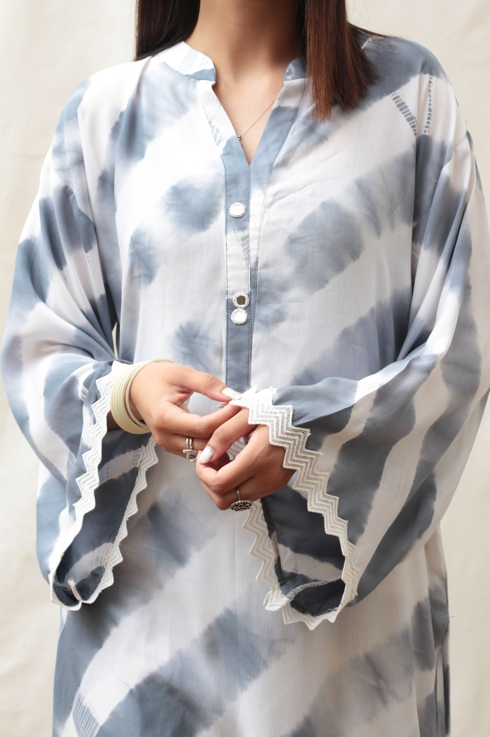 Our inhouse customized self-hand dyed Flowey malaee lawn shirt, with lace on the sleeves and hem with handmade sheesha buttons, can be paired with a matching dyed trouser.