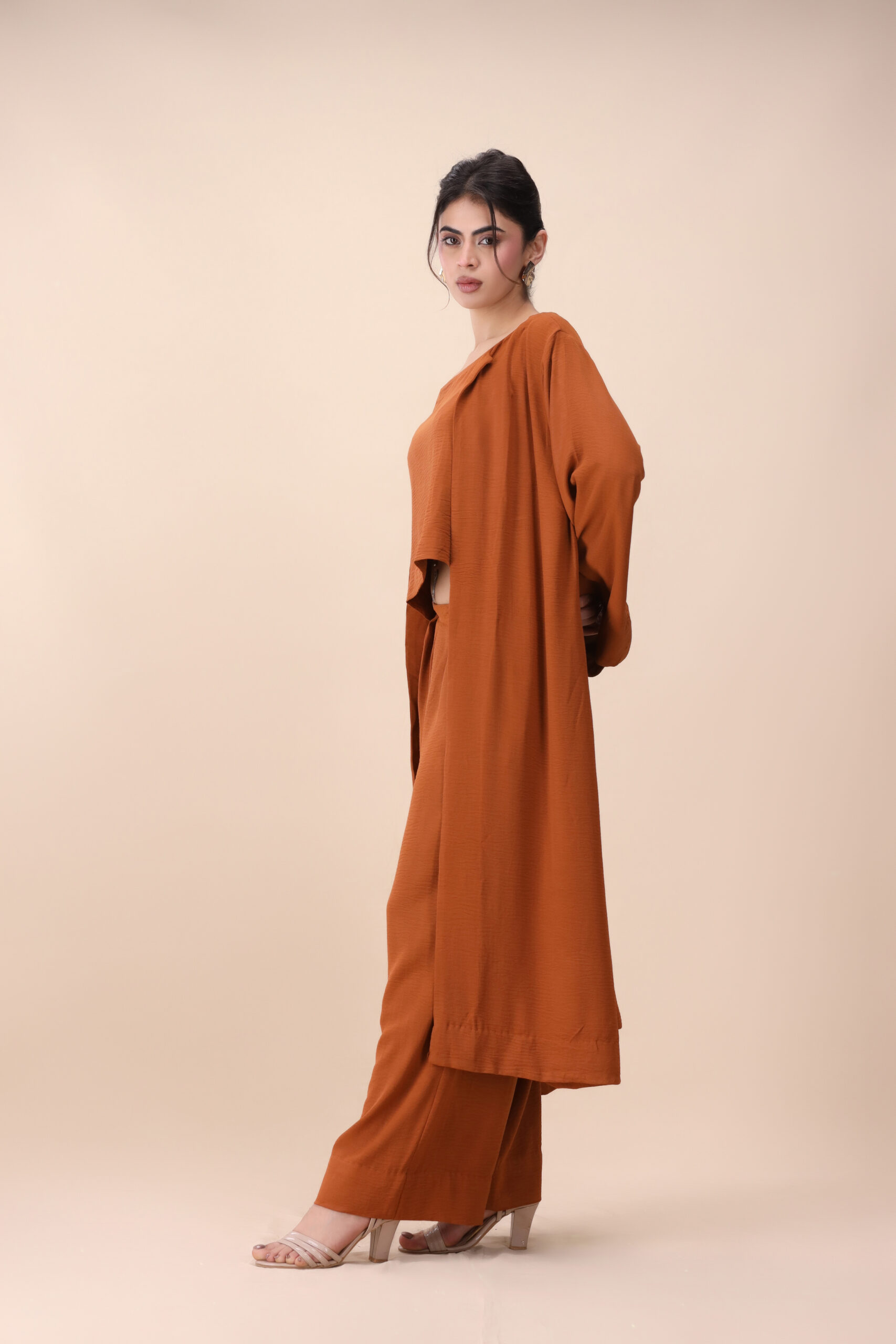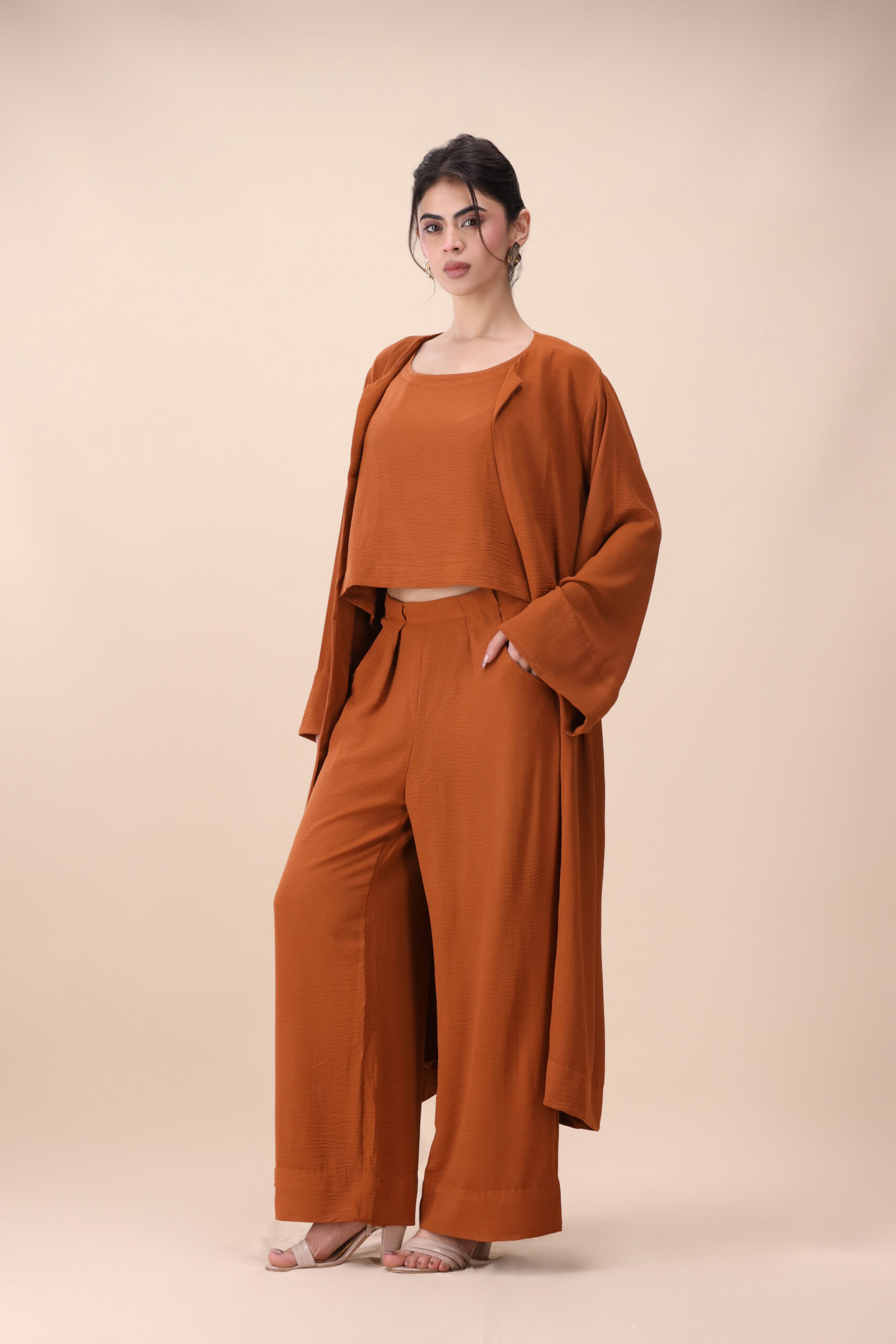 A warm rust-toned three-piece co-ord featuring an inner top, wide-leg trousers, and a long open-front layer. Designed to be worn together or styled separately, this set offers versatility while maintaining a cohesive, elegant look.