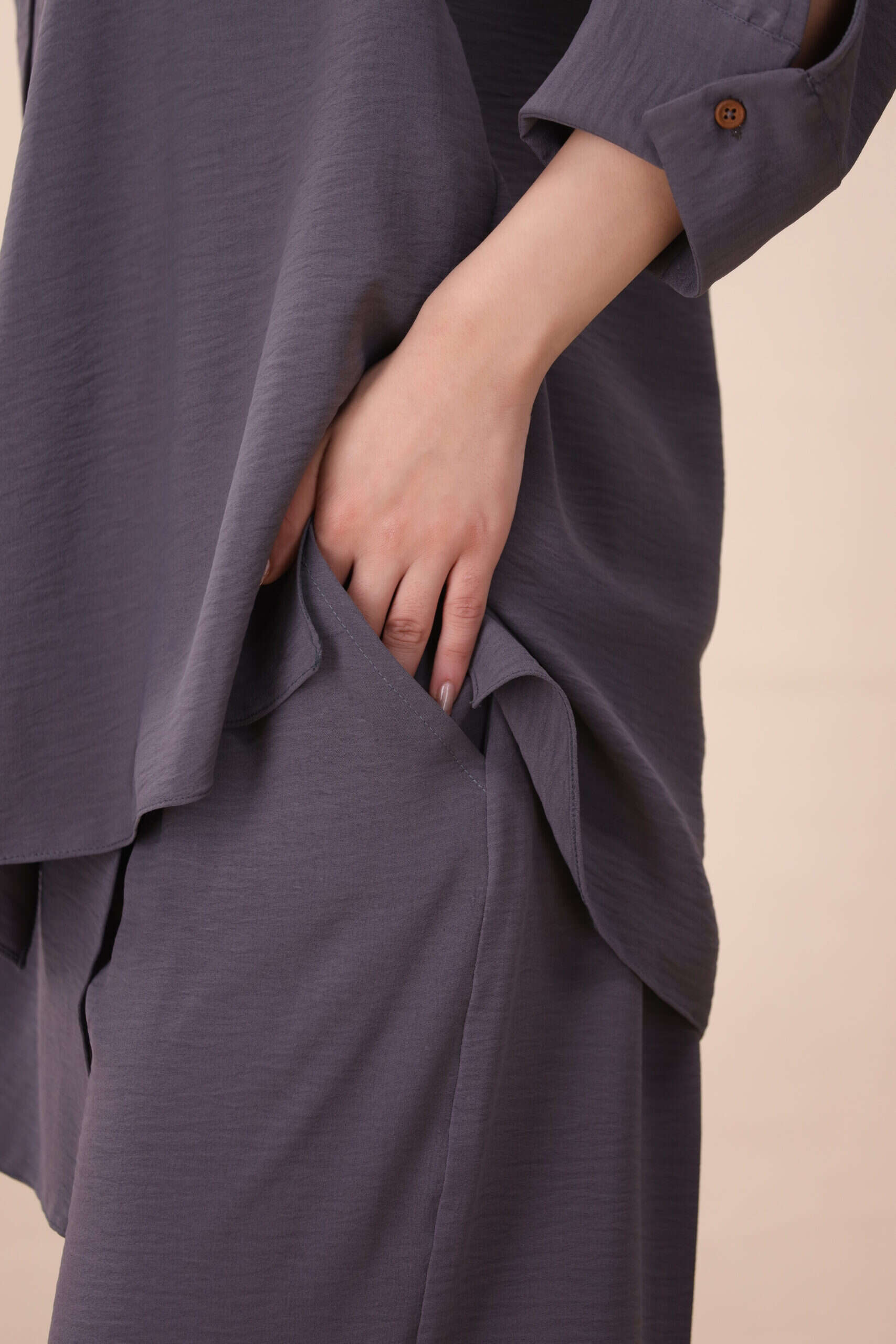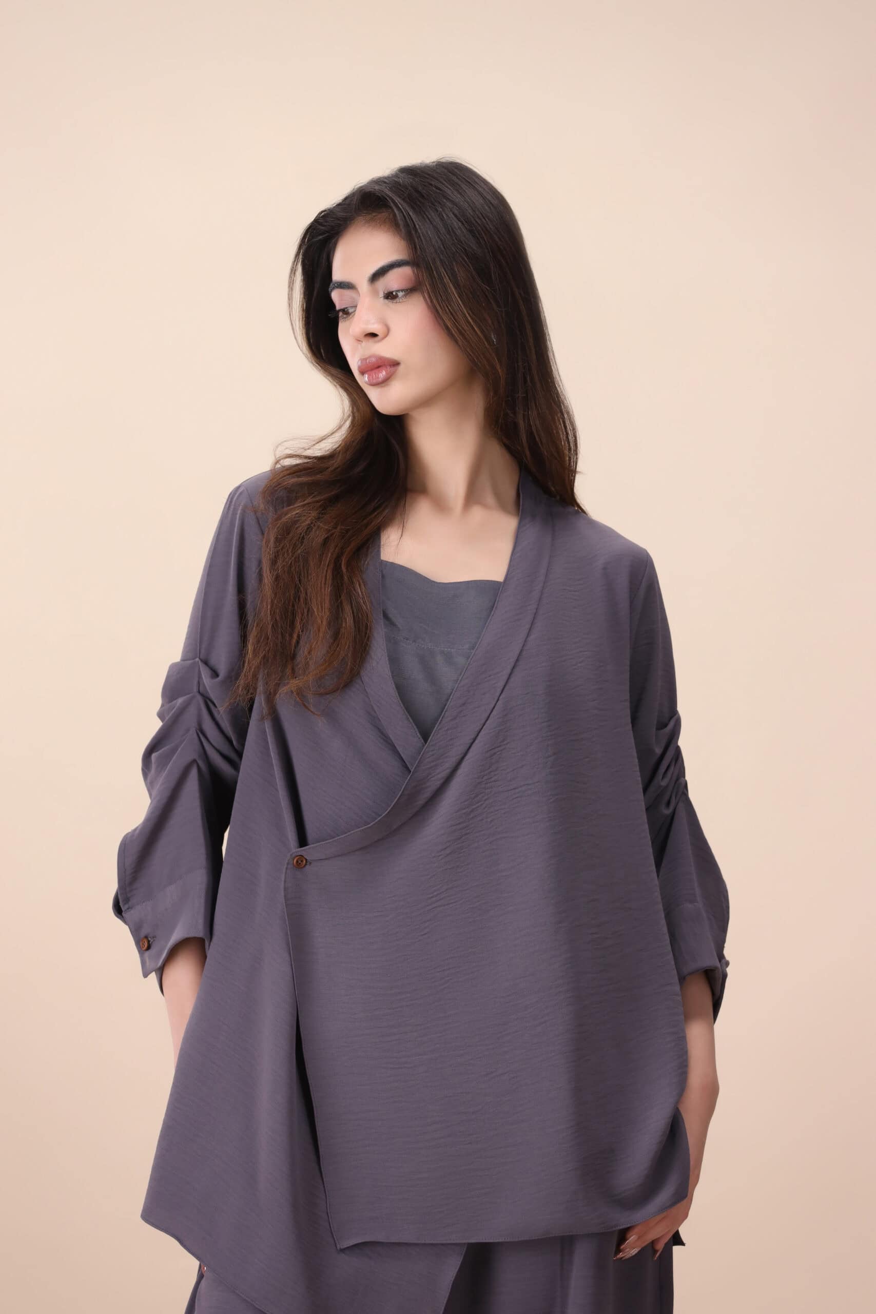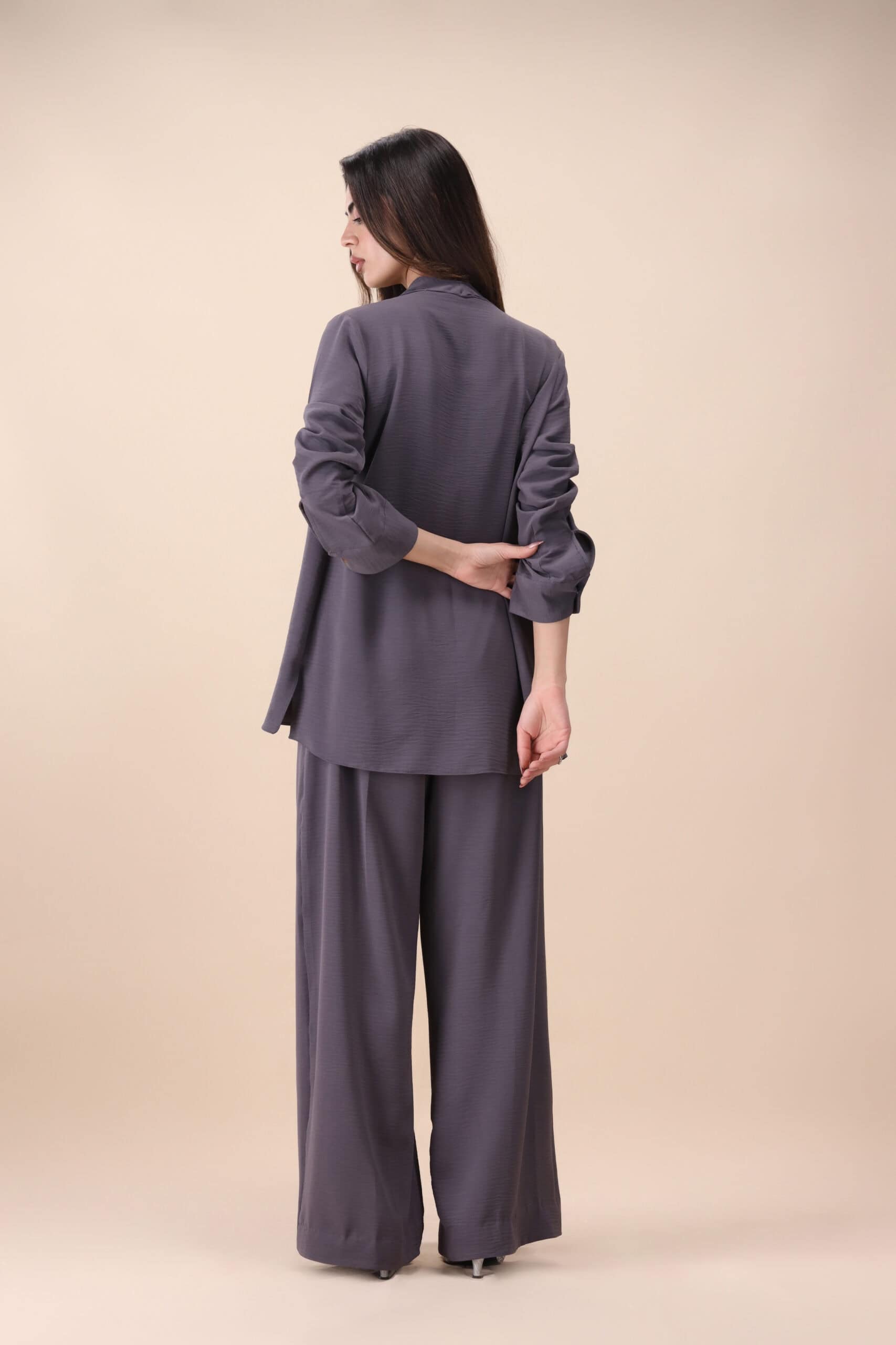 A modern layered co-ord designed for effortless sophistication. Featuring a softly draped asymmetric top paired with fluid wide-leg trousers, this set balances structure with movement. The muted steel grey tone makes it a versatile choice for both day and evening wear, offering comfort without compromising on style.