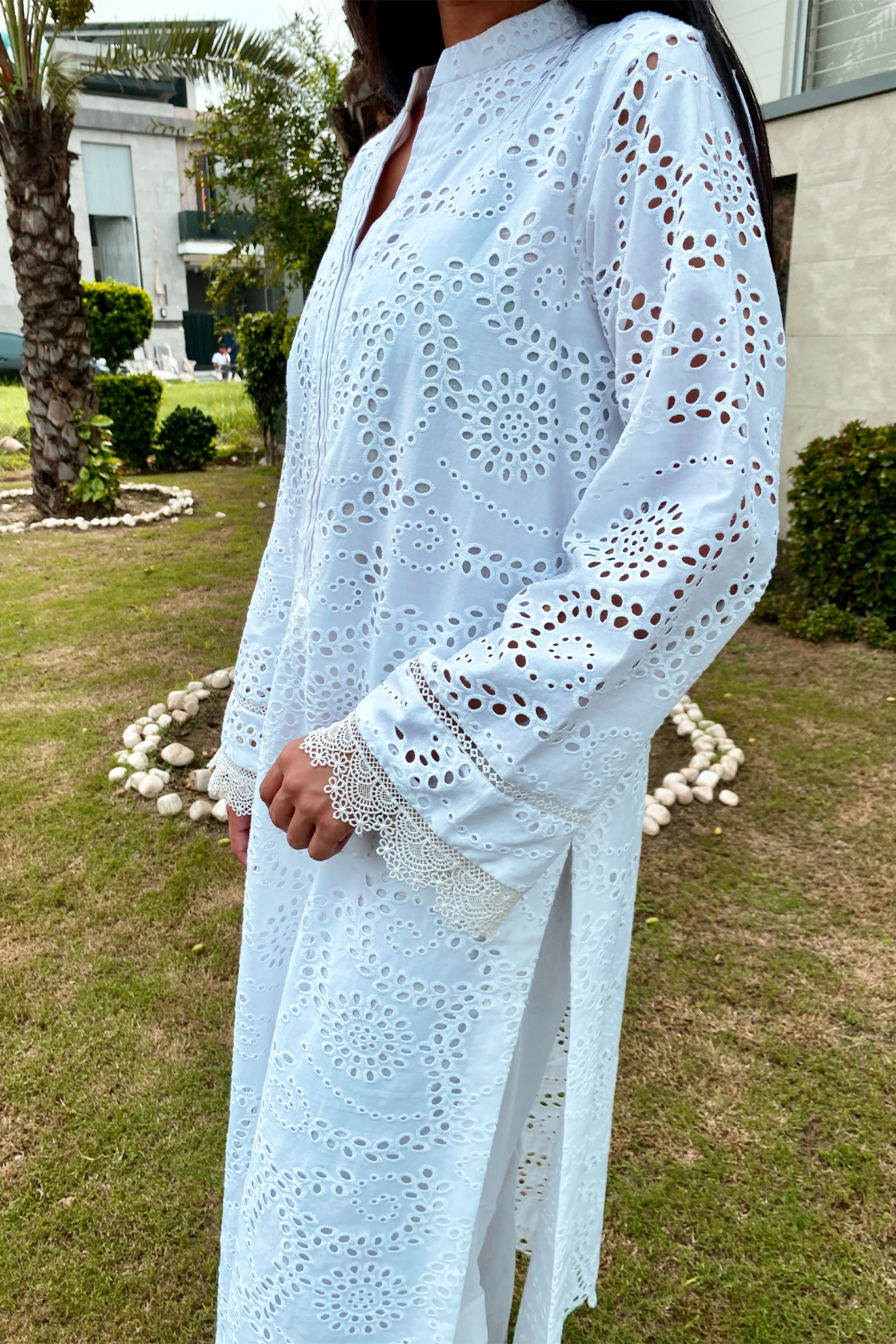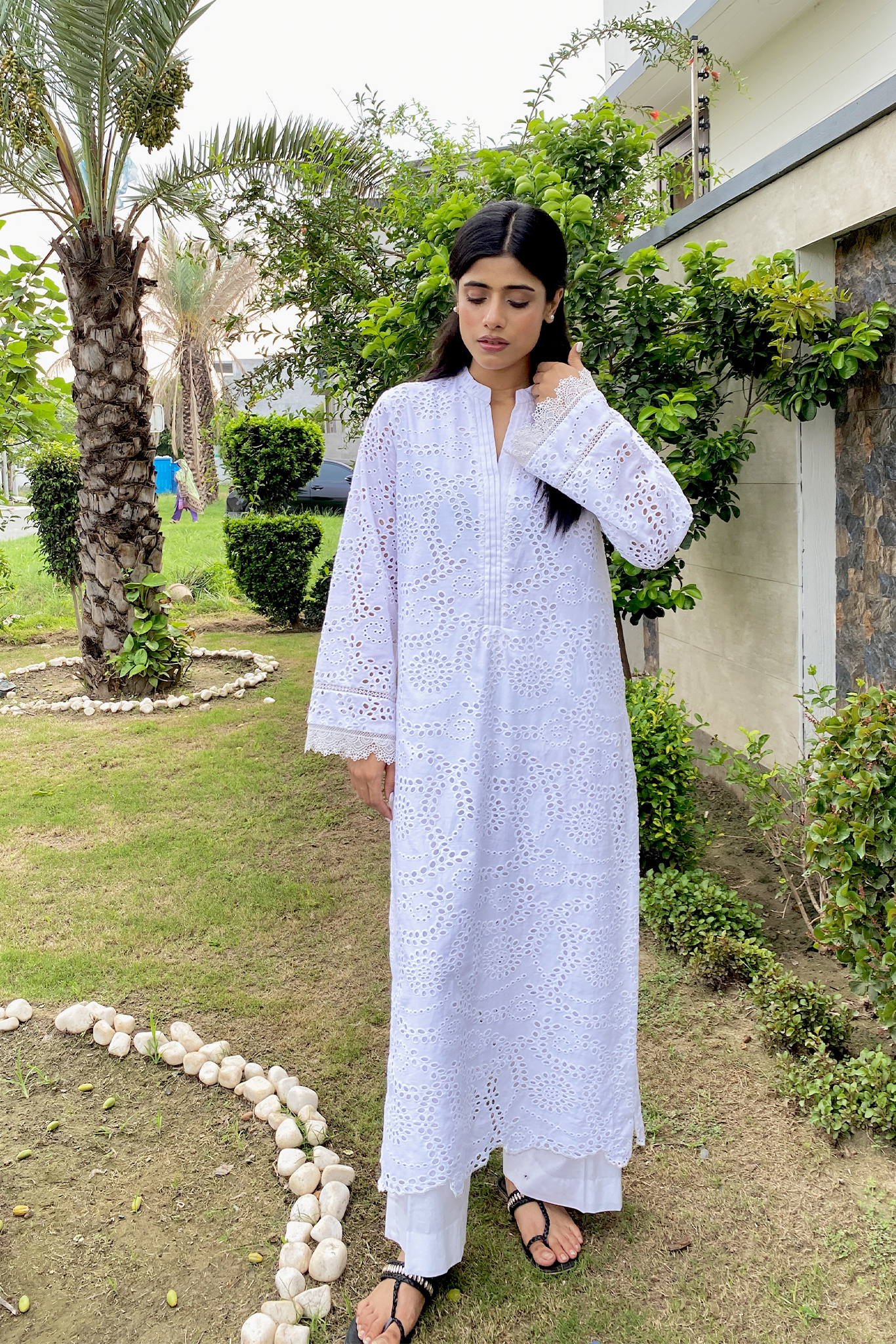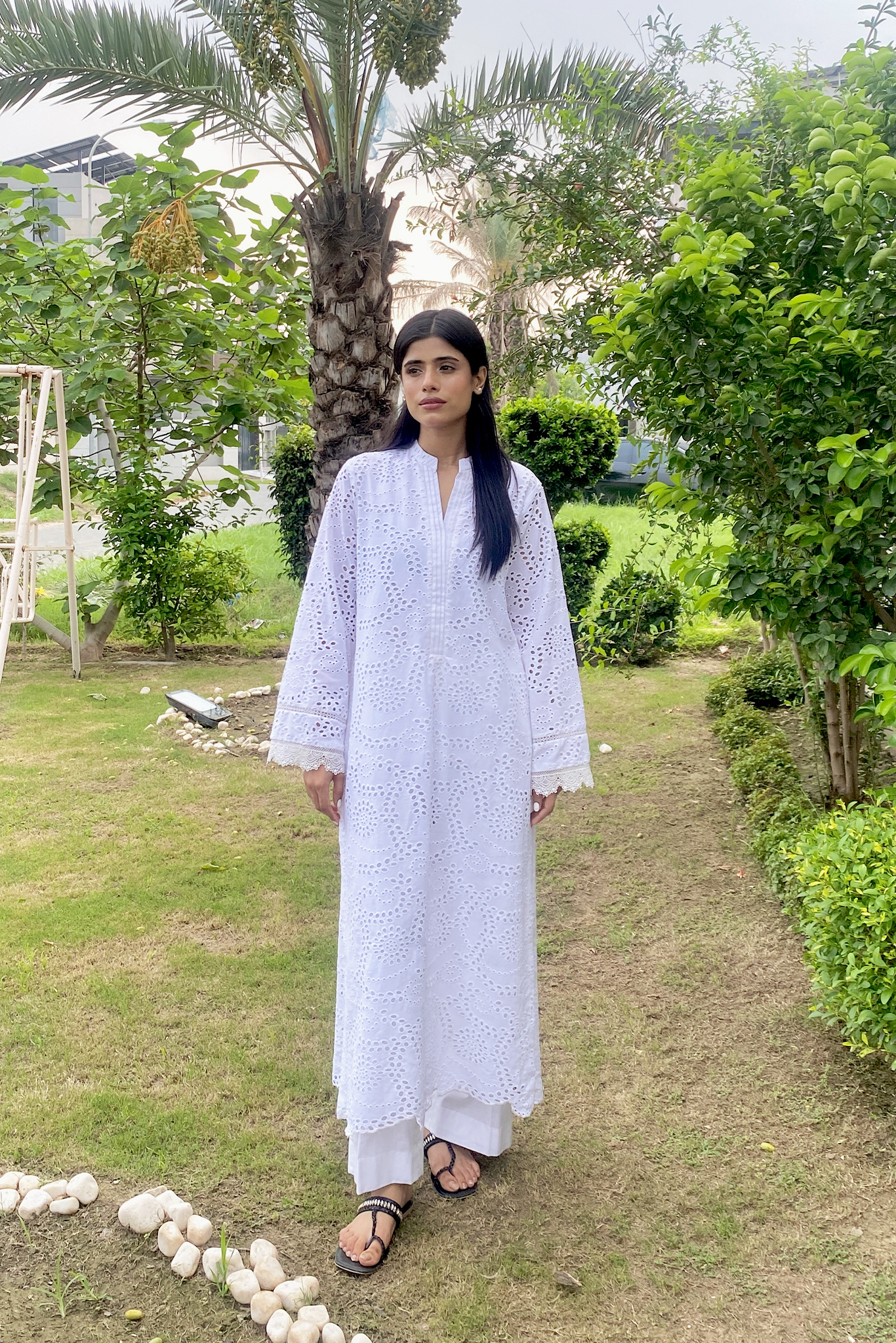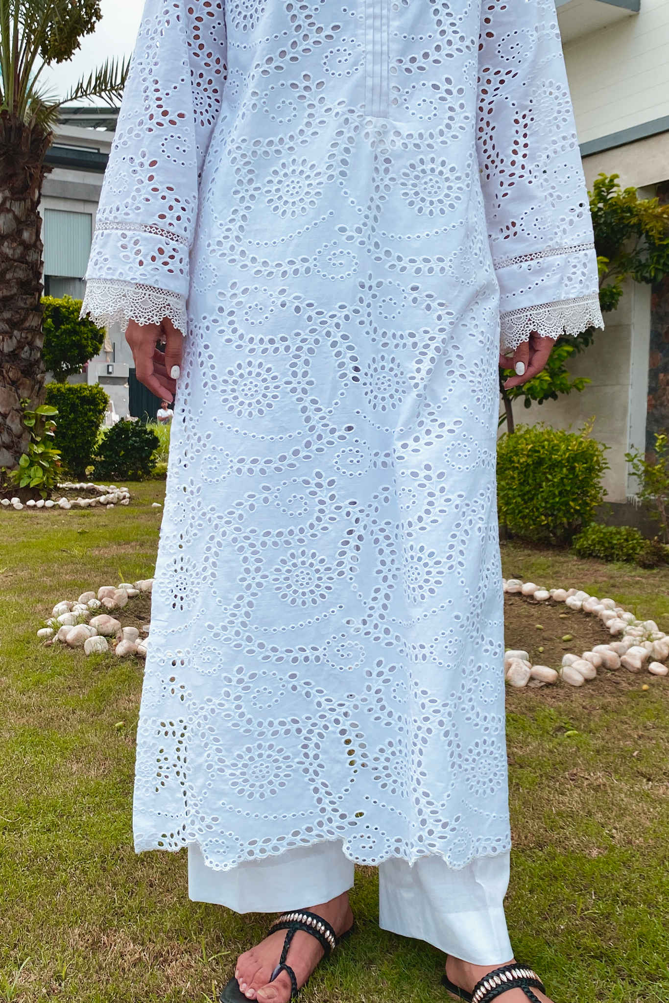 Grace meets elegance in our white Chikan Kari Kurta Set – a timeless expression of purity and finesse. Soft breathable cotton Chikan kari, this full-sleeved kurta features a straight, relaxed silhouette with scalloped cuffs and intricate cutwork throughout. The serene white hue adds an effortless charm, perfect for warm days or understated festive occasions. Paired with straight cotton trousers, it’s a versatile wardrobe essential that speaks of classic sophistication.