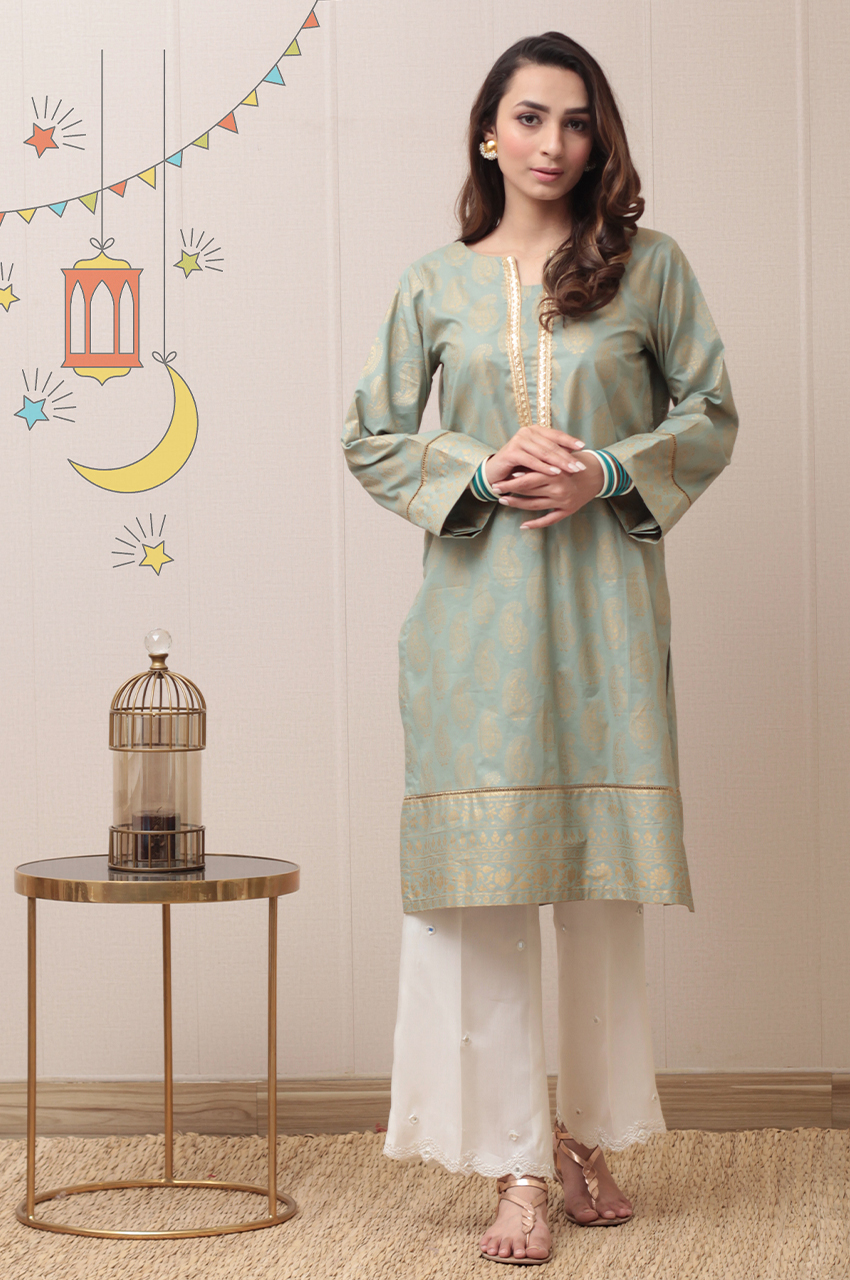 Screen printed fine lawn, with gotta lace on neck, neatly finished with tilla lace. Paired with sheesha trouser